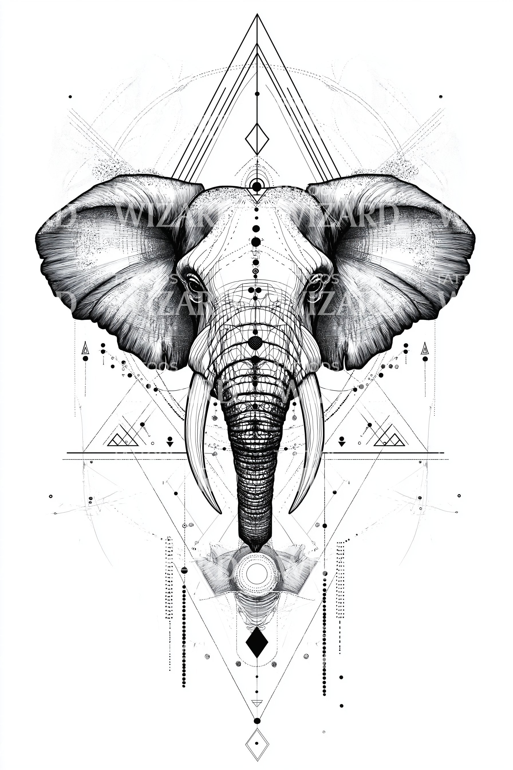Majestic fineline elephant emerges from sacred geometry, its tusks framed by precise symmetry, delicate linework and dotwork mapping a quiet cosmos. Elephant symbolizes wisdom, memory, guardianship; aligned chakral dots suggest spiritual grounding. Wearing this piece feels centered and powerful, a calm compass guiding strength, compassion, and steady purpose.