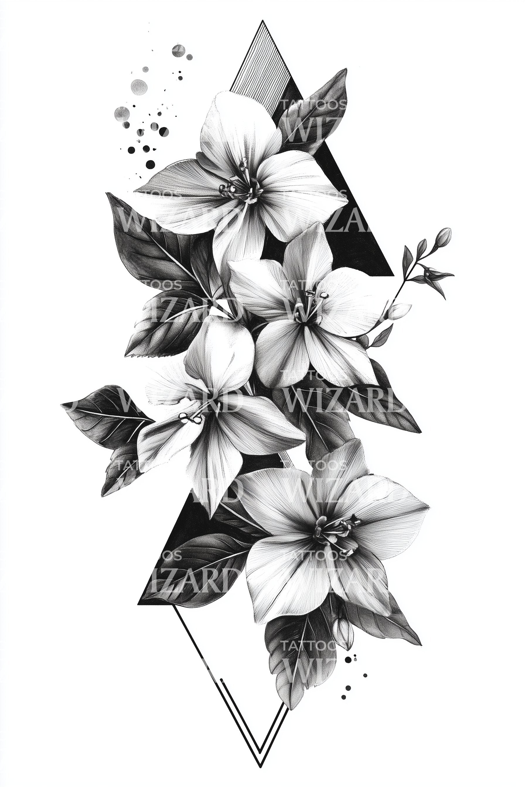 Dompel jezelf onder in de schoonheid van dit geometrische tatoeageontwerp, met betoverende abstracte patronen. Fijne driehoeken vormen de kernstructuur, aangevuld met een fascinerend bloemrijk boeket. Ervaar de kunstzinnige mix van de delicate kenmerken van bloemen, die een unieke en stijlvolle manier bieden om je persoonlijkheid uit te drukken.