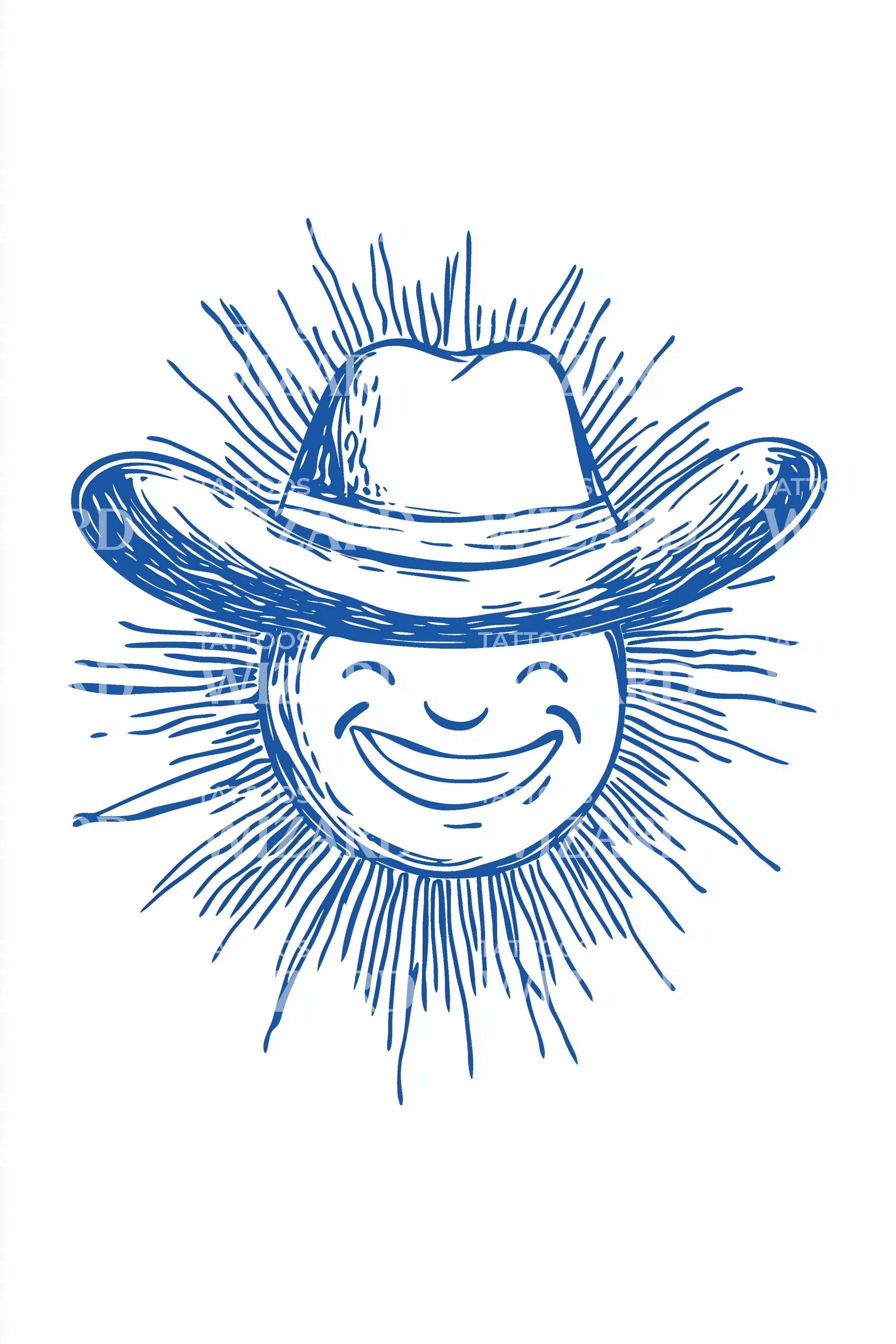 Rij in de klassieke Western charme met dit schetsstijl tatoeageontwerp: een glimlachende cowboy onder een stralende zon, hoed schuin in ontspannen zelfvertrouwen. Losse potloodlijnen en lichte schaduwen creëren beweging en warmte, perfect voor onderarm, schouder of kuit. Tijdloos, speels en robuust—zonovergoten grensgeest. Weerspiegelt de vrijheid en optimisme van de open vlakte.