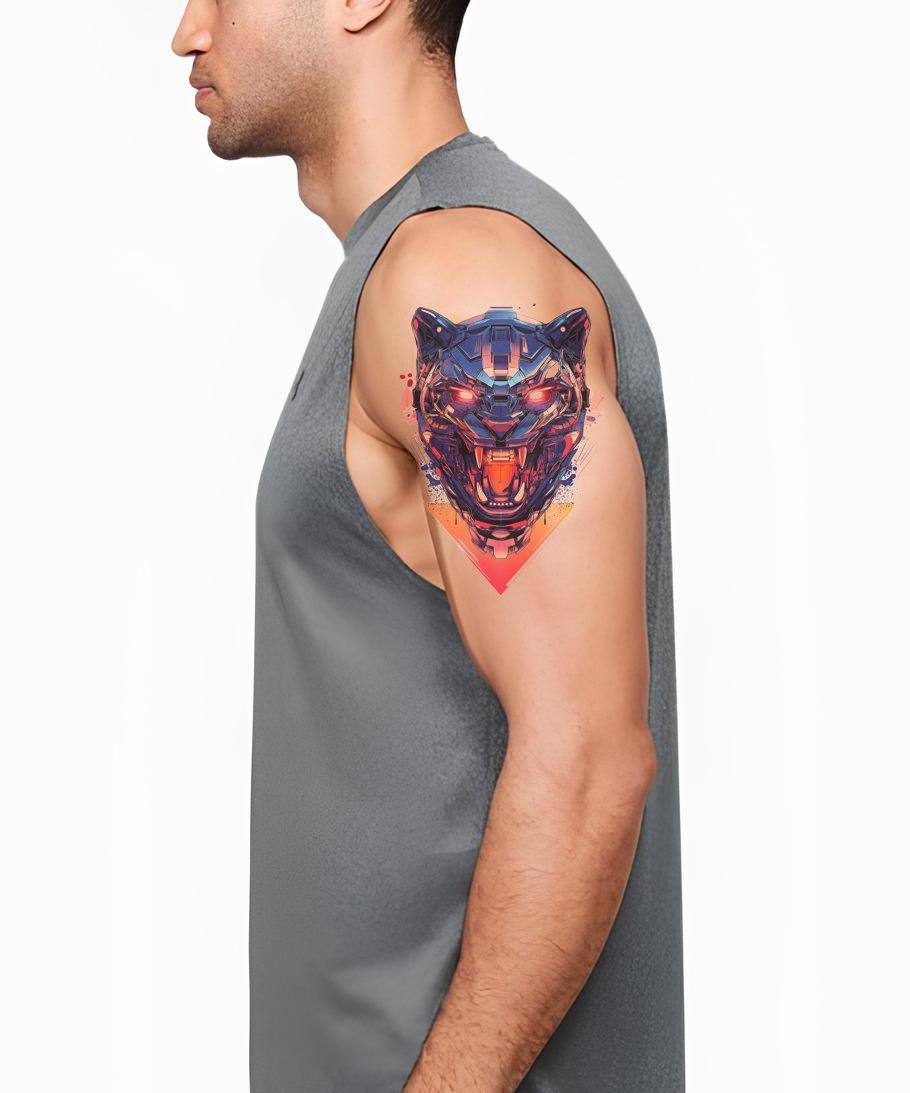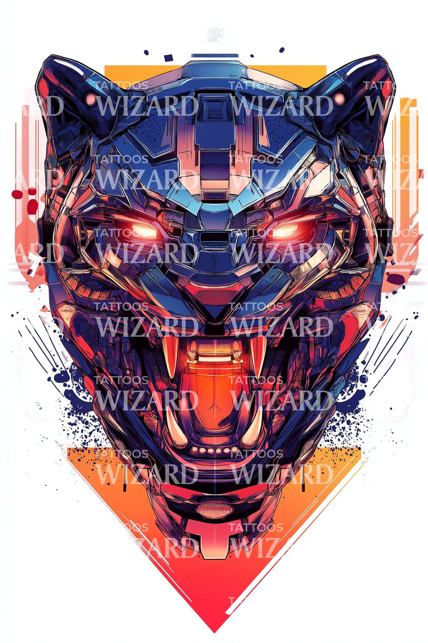 Ontketen je futuristische vibes met dit verbluffende Newschool-tattooontwerp. Omhuld met neon cybernetica en een gemaskerd mysterie, belichaamt deze tech-geïnspireerde tijger de perfecte mix van wilde kracht en sci-fi esthetiek. Laat deze tattoo jouw statement zijn, die je affiniteit voor het baanbrekende en het ontembare onthult.