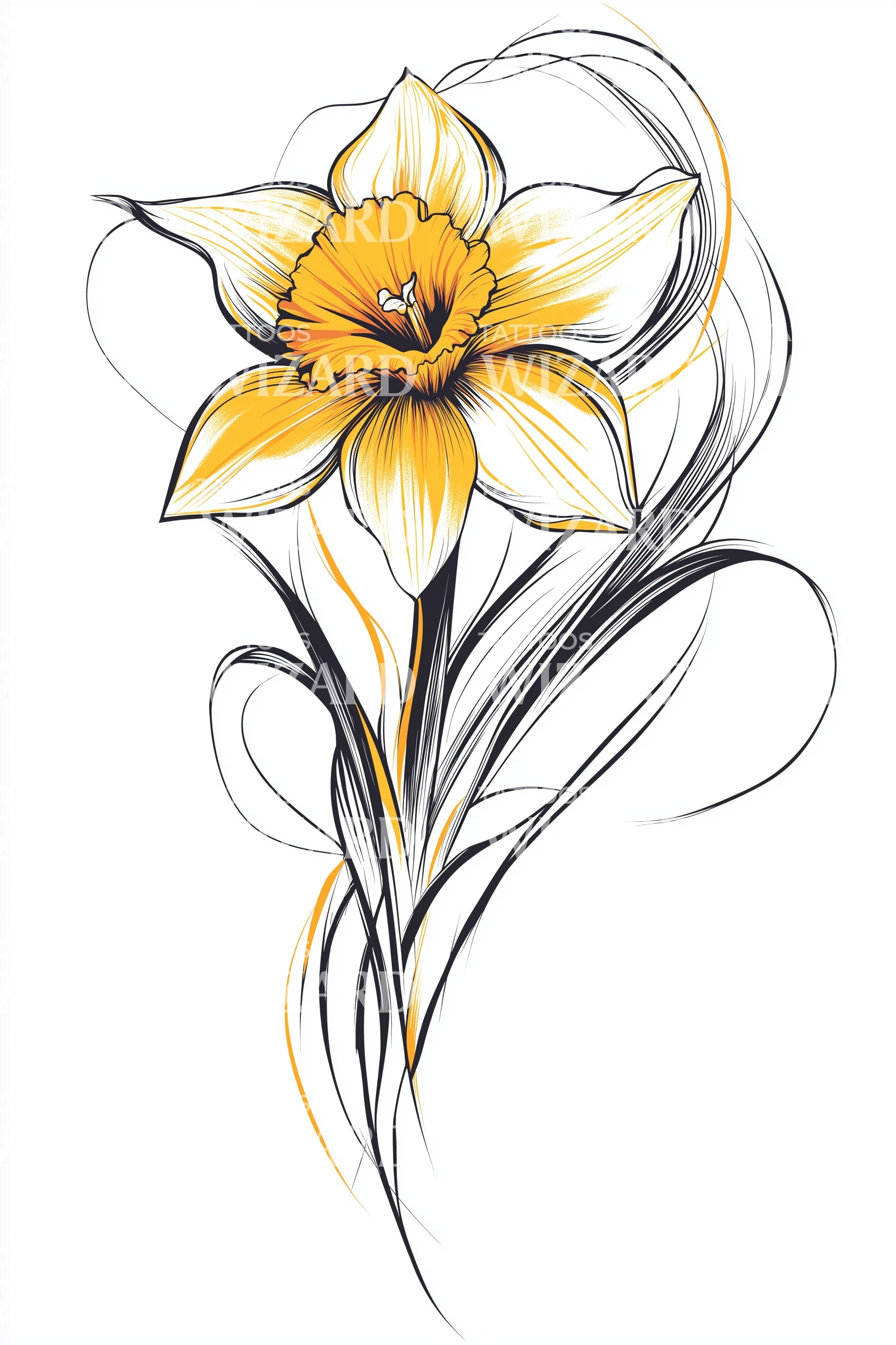Duik in het buitengewone met dit neotraditionele tatoeageontwerp, dat op artistieke wijze speelsheid en gratie uitdrukt. Met een delicate narcis als middelpunt, vangt de sierlijke stroom van het ontwerp prachtig de natuurlijke charme van de bloem, waardoor het jouw perfecte keuze is om je liefde voor de natuur op je huid te dragen.