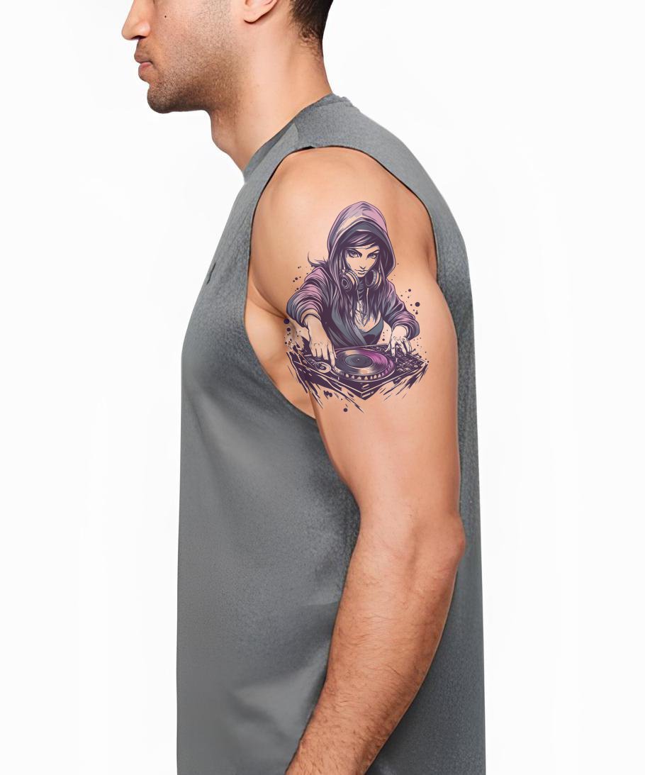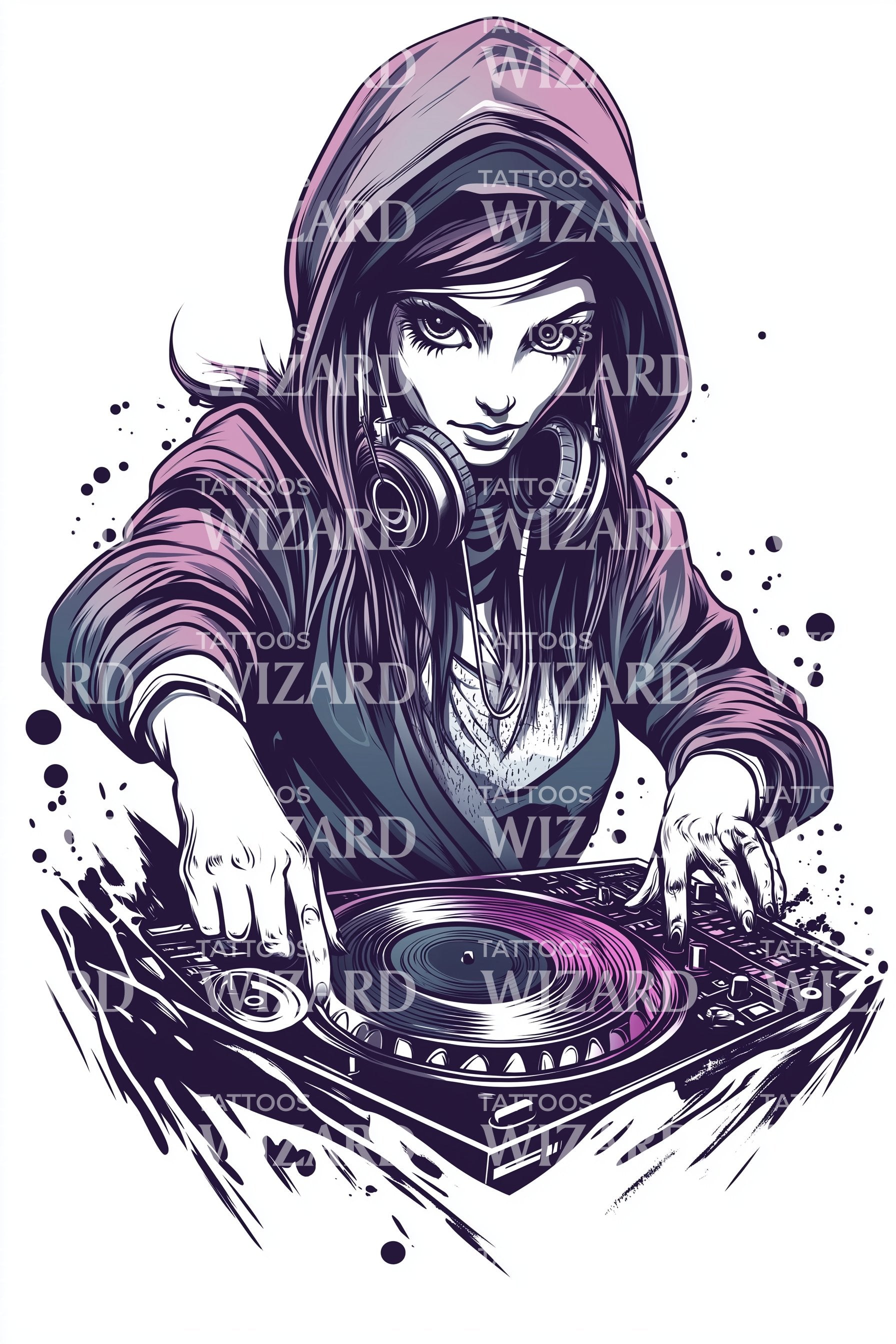Ontketen je innerlijke DJ-geest met dit opvallende tattoo-ontwerp, met een figuur met capuchon die meesterlijk beats draait op een draaitafel. Perfect de straatstijl en de rauwe energie van muziek vastleggend, is deze illustratieve tattoo een iconisch symbool van passie voor ritme en grooves.