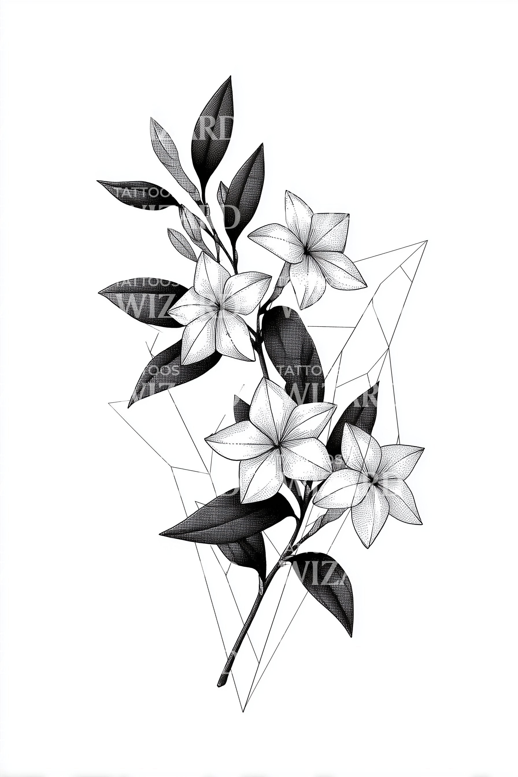 Dompel je huid onder in een moderne mix van natuur en kunst met ons geometrische jasmijnboeket tatoeageontwerp. Met een verfijnde lijnvoering symboliseert het de delicate schoonheid van jasmijnbloemen. De strakke, geometrische opzet geeft een vleugje moderniteit aan dit tijdloze bloemmotief.