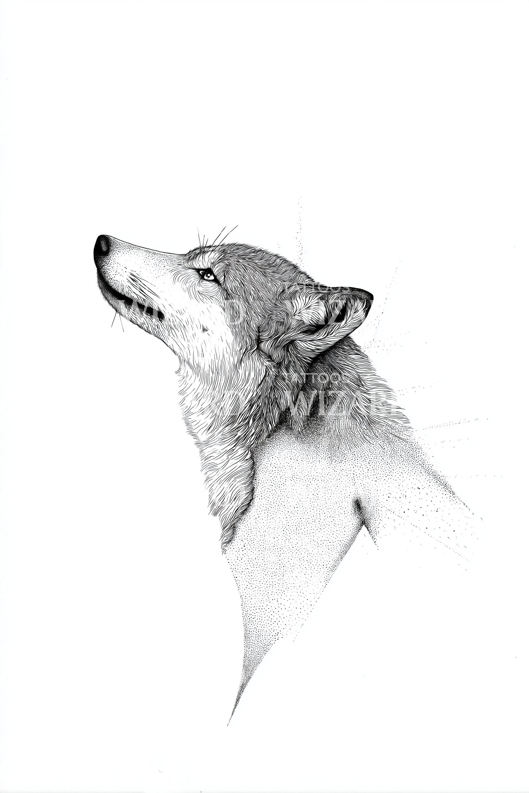 A lifelike wolf portrait tilts skyward, fur rendered in delicate linework and stippled shading, each hair etched with reverent realism. Its poised howl honors instinct, loyalty, and the courage to speak truth into wild silence. Worn close, it steadies the spirit, inviting resilience, vigilance, and untamed calm within.