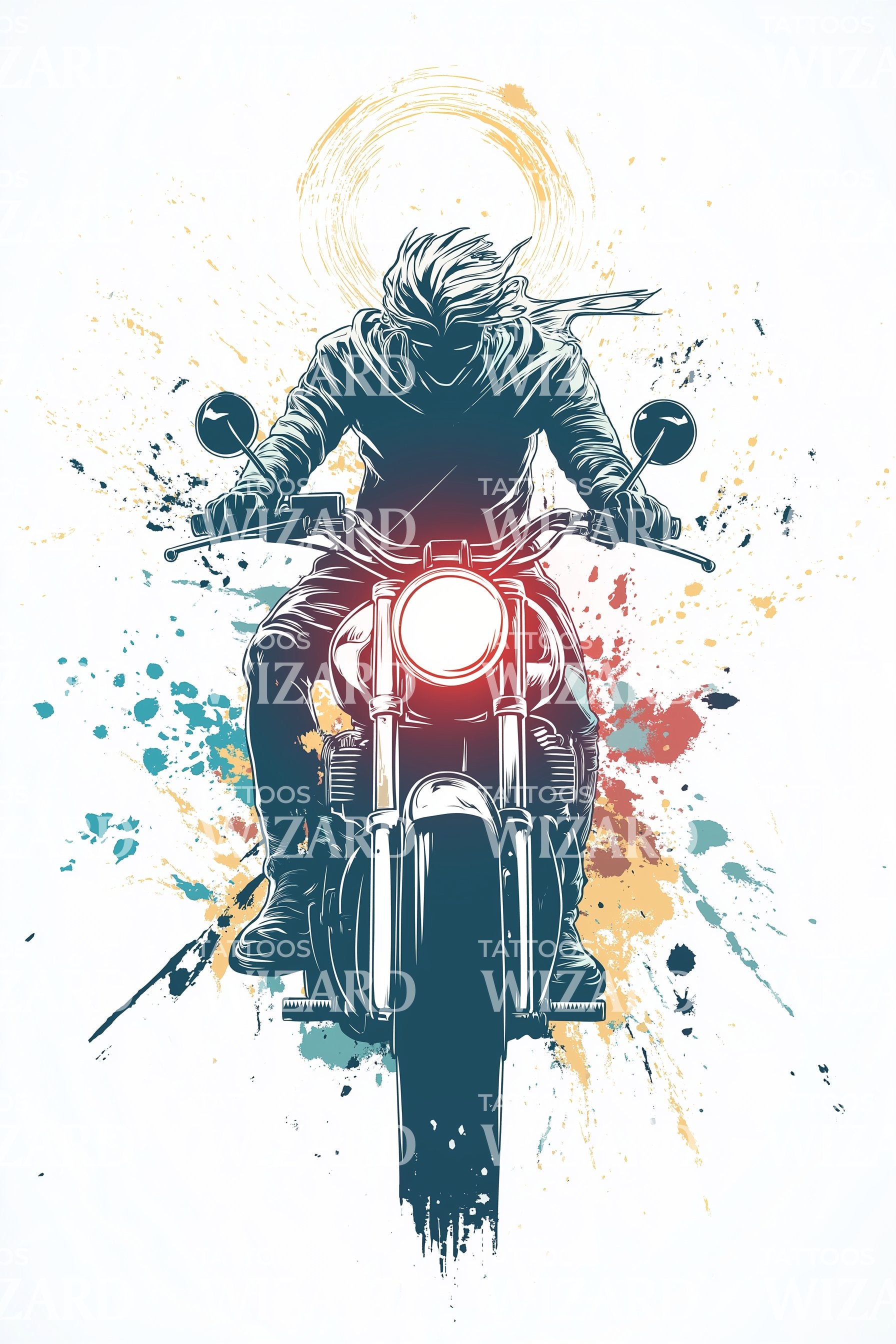 Ervaar de rauwe energie van de open weg met dit newschool tattoo ontwerp. Met een levendige, kleurige straat scène met een motorcoureur in het midden, vangt het de vrijheid en opwinding van de reis, waardoor het een uitstekende keuze is voor liefhebbers die leven om te rijden.