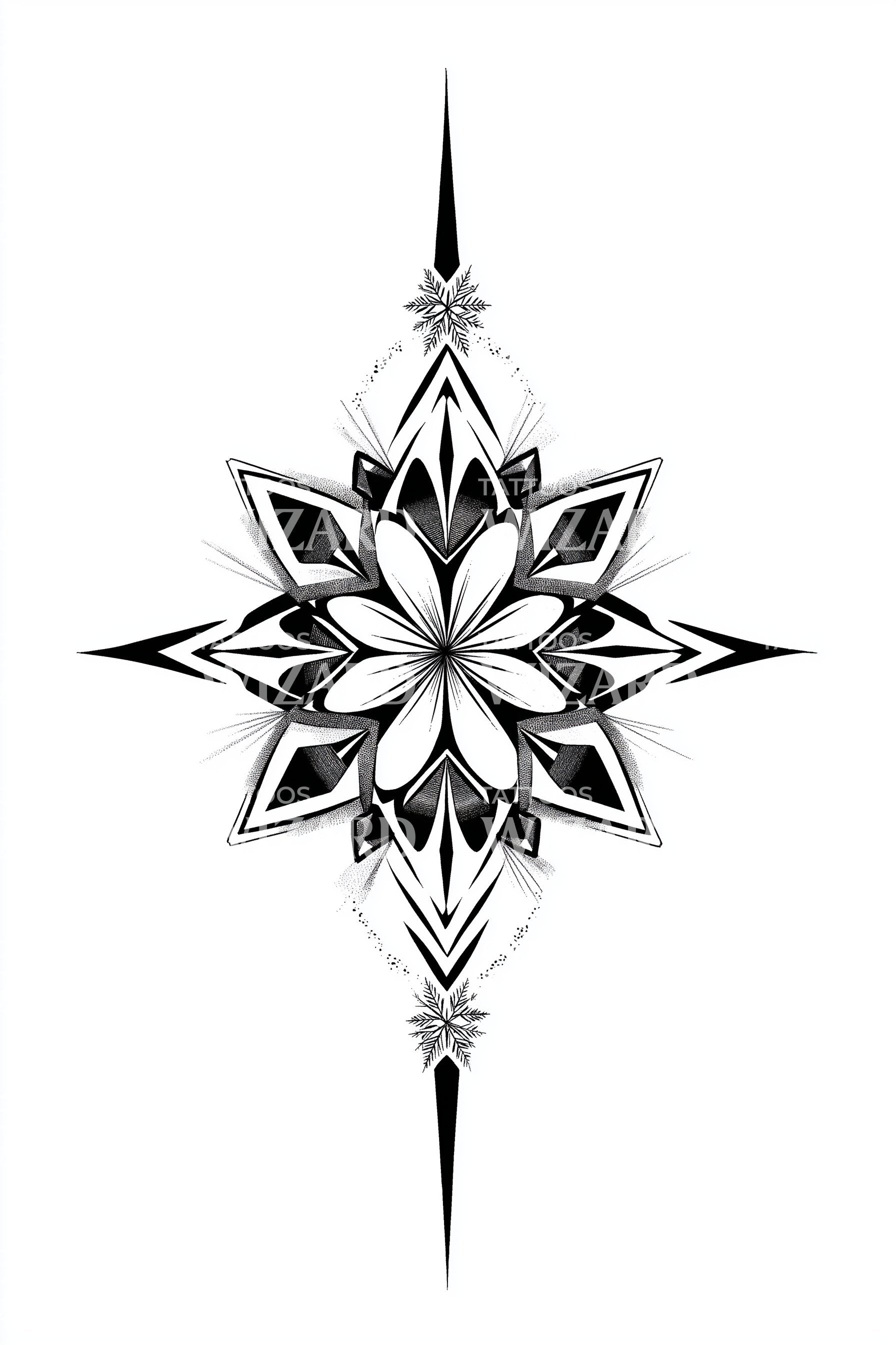 Frost-kissed mandala star blooms in crisp blackwork, four compass points piercing outward, petals nested in geometric diamonds and delicate dotwork. Snowflake accents evoke winter clarity and true north. A symbol of guidance, stillness, and resilience, it wraps the wearer in quiet focus, elegant strength, and calm direction.
