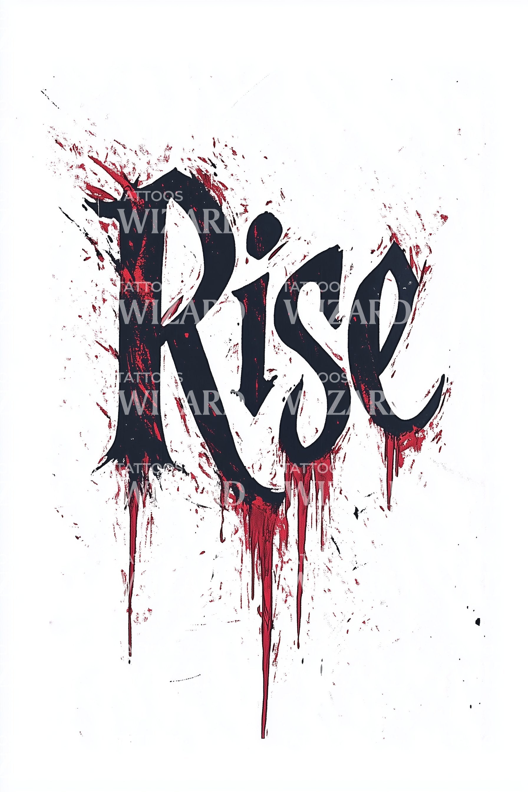 Street-born watercolor script erupts in bold letters, splashed with crimson drips and graffiti grit. Rise becomes a vow: ascend from spill of struggle, turn scars into momentum. Wearing it feels electric, charged with colorful street energy. Ideal on forearm, calf, spine, or ribs, where vertical flow and gravity-loving drips sing.