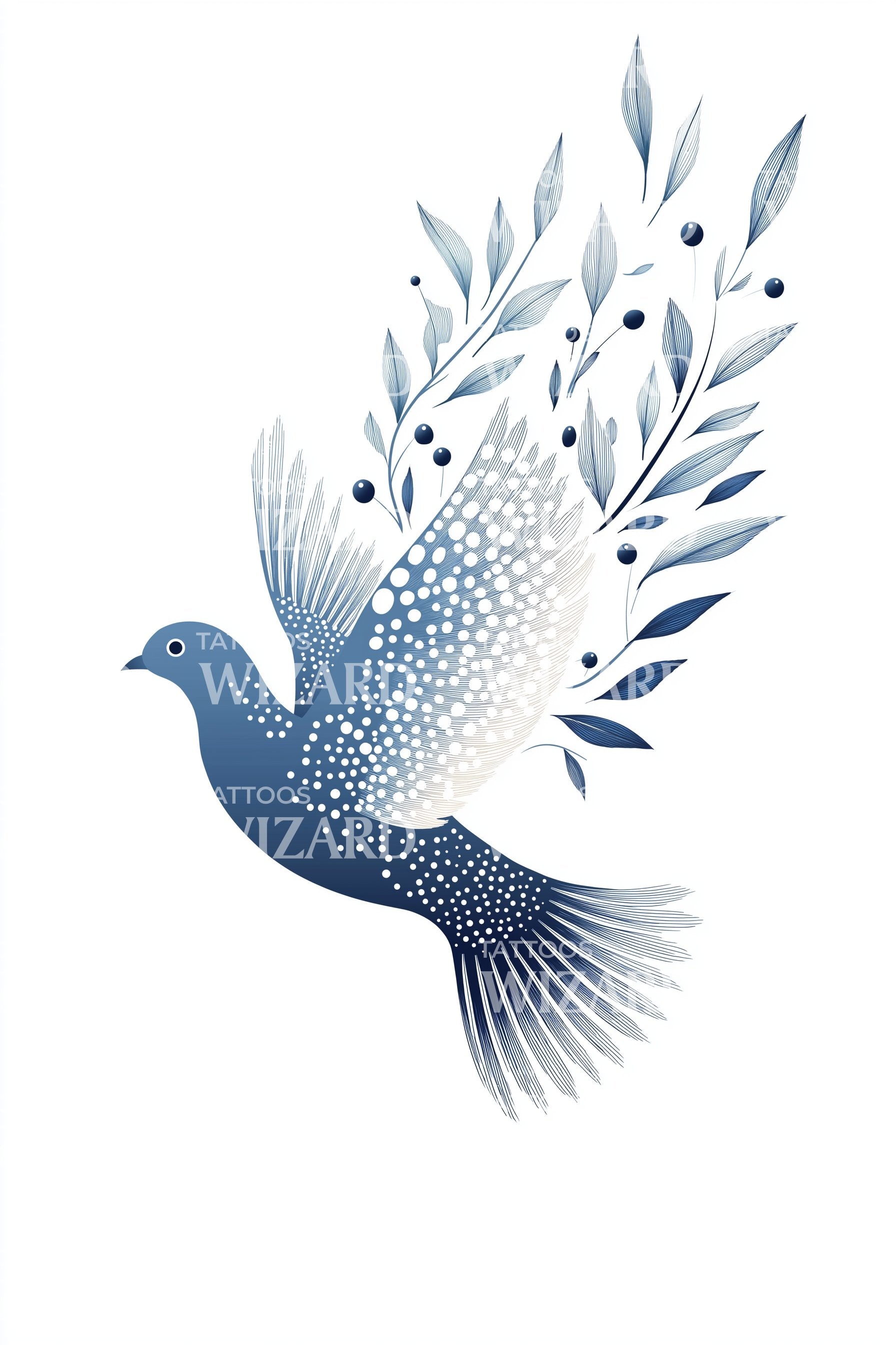 Omarm rust met dit minimalistische tatoeageontwerp! Het toont een abstracte weergave van een duif, moeiteloos gemaakt met zachte blauwe spatten die een gevoel van vrede oproepen. Deze minimalistische esthetiek biedt subtiele en verfijnde lichaamskunst voor de liefhebber van eenvoud en symboliek.
