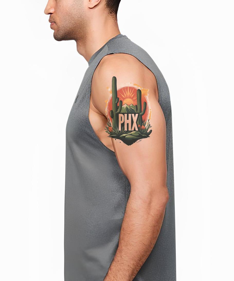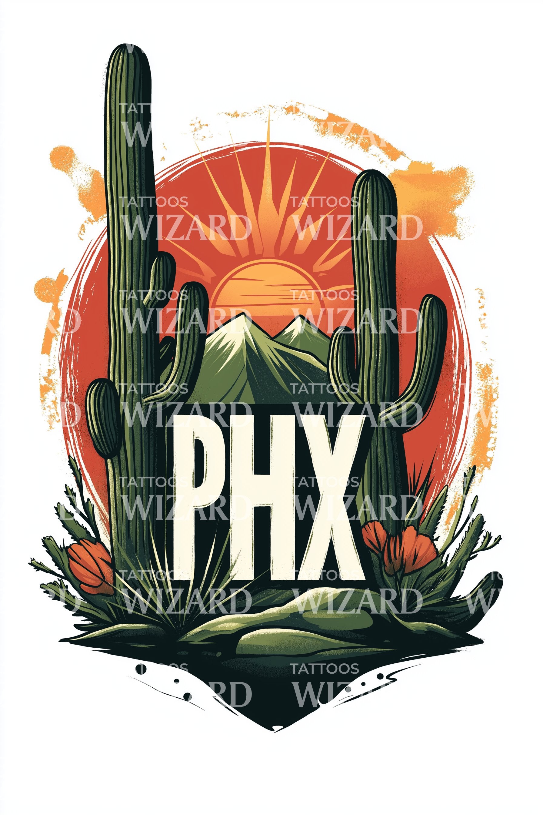 Neotraditional composition with bold PHX lettering framed by towering cactus, agave, and desert blooms, set against a blazing Arizona sunset and mountain silhouettes. The rising sun evokes the phoenix, symbolizing renewal and grit. Wearer feels sunlit resolve, hometown pride, and wander-ready calm, rooted yet fiercely alive everywhere.