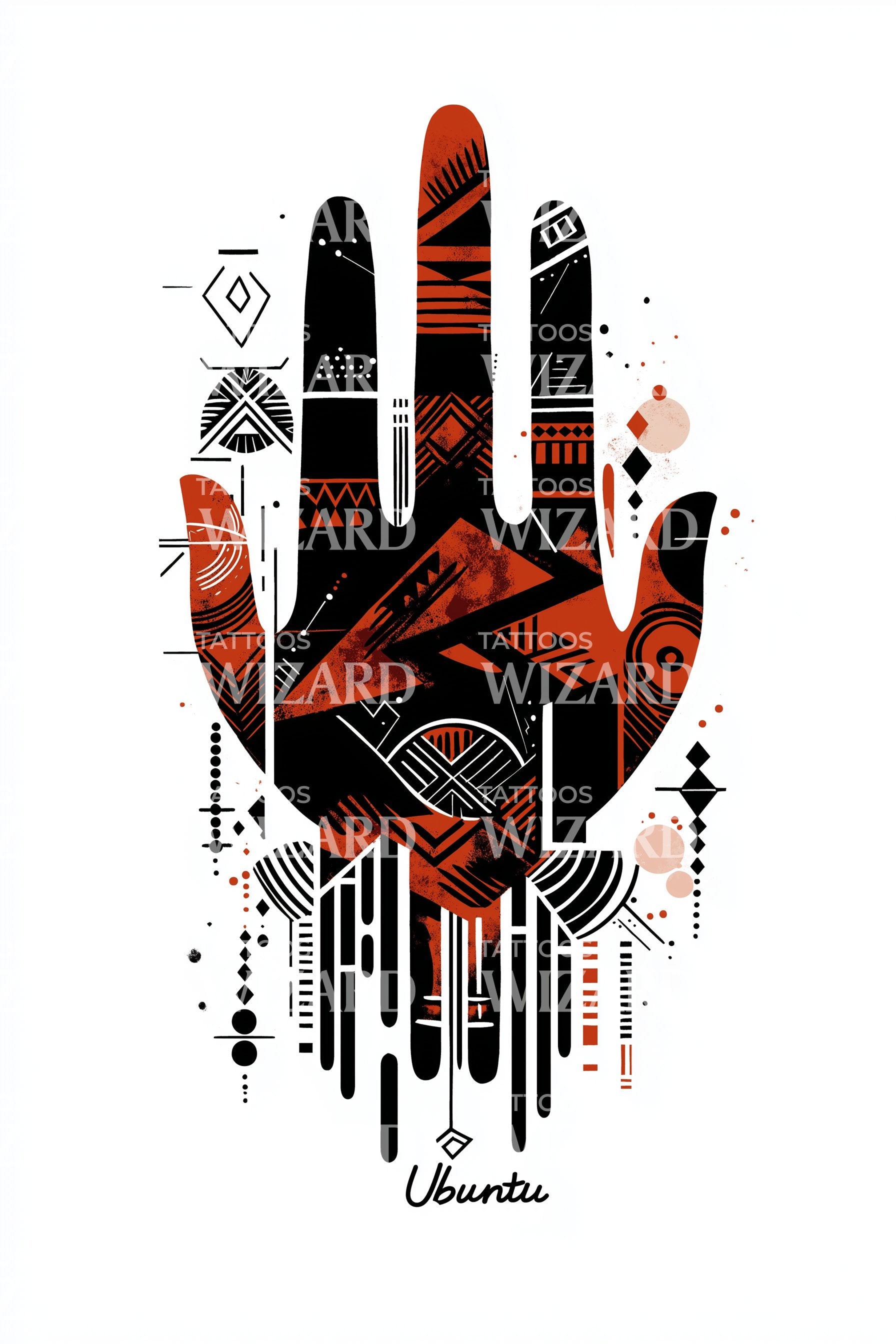 Open hand of ubuntu, inked in obsidian and ochre geometry, fuses tribal rhythms with tech circuitry and dripping sigils. A shield of connection, it honors give and receive, community, protection. Wearer feels grounded, future-ready, held by kin. Ideal on forearm, sternum, upper back, or calf for vertical flow.
