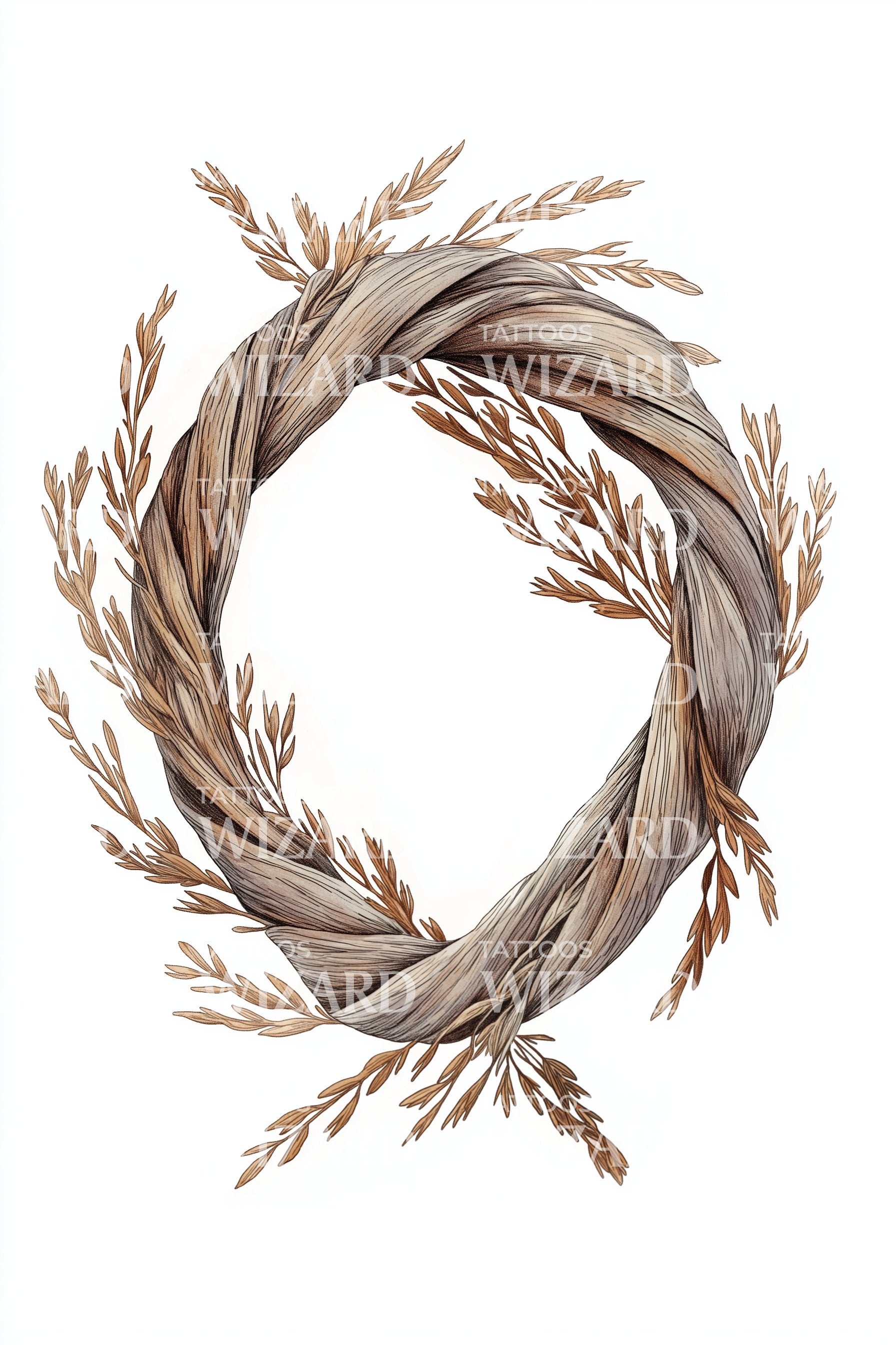 Dompel jezelf onder in de schoonheid van de natuur met dit unieke tatoeageontwerp. Met een mix van delicate bloemen, symbolisch geladen tarwe en een omvattende krans, staat dit ontwerp voor oogst, graan en de voortdurende cyclus van het leven. Ideaal voor iedereen die op zoek is naar een ontwerp dat groei en de rijkdom van de natuur vertegenwoordigt.
