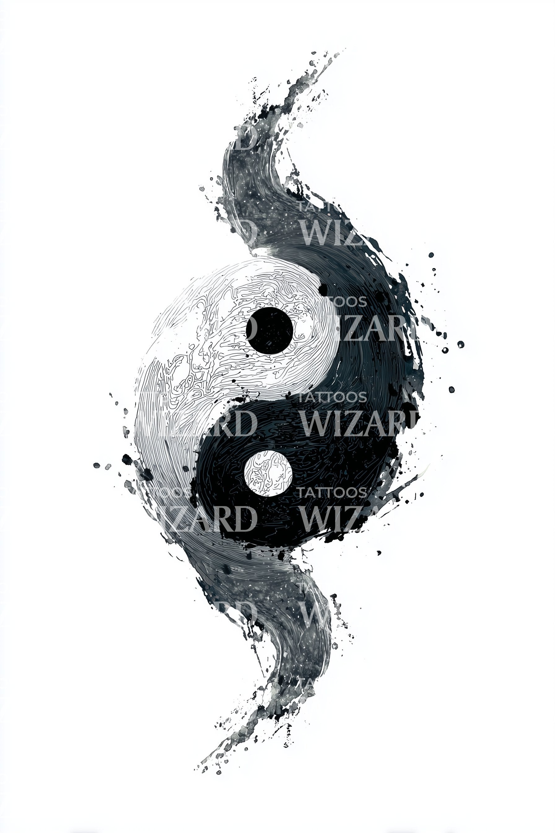 Watercolor yin yang blooms in stormy ink, swirling arcs and paint splash textures tracing delicate topographic lines. Symbolizes balance of light and shadow, movement within stillness, opposites harmonized. Wears like calm momentum, grounding yet fluid. Ideal placements: spine or sternum for vertical flow, forearm or calf for elegant sweep.
