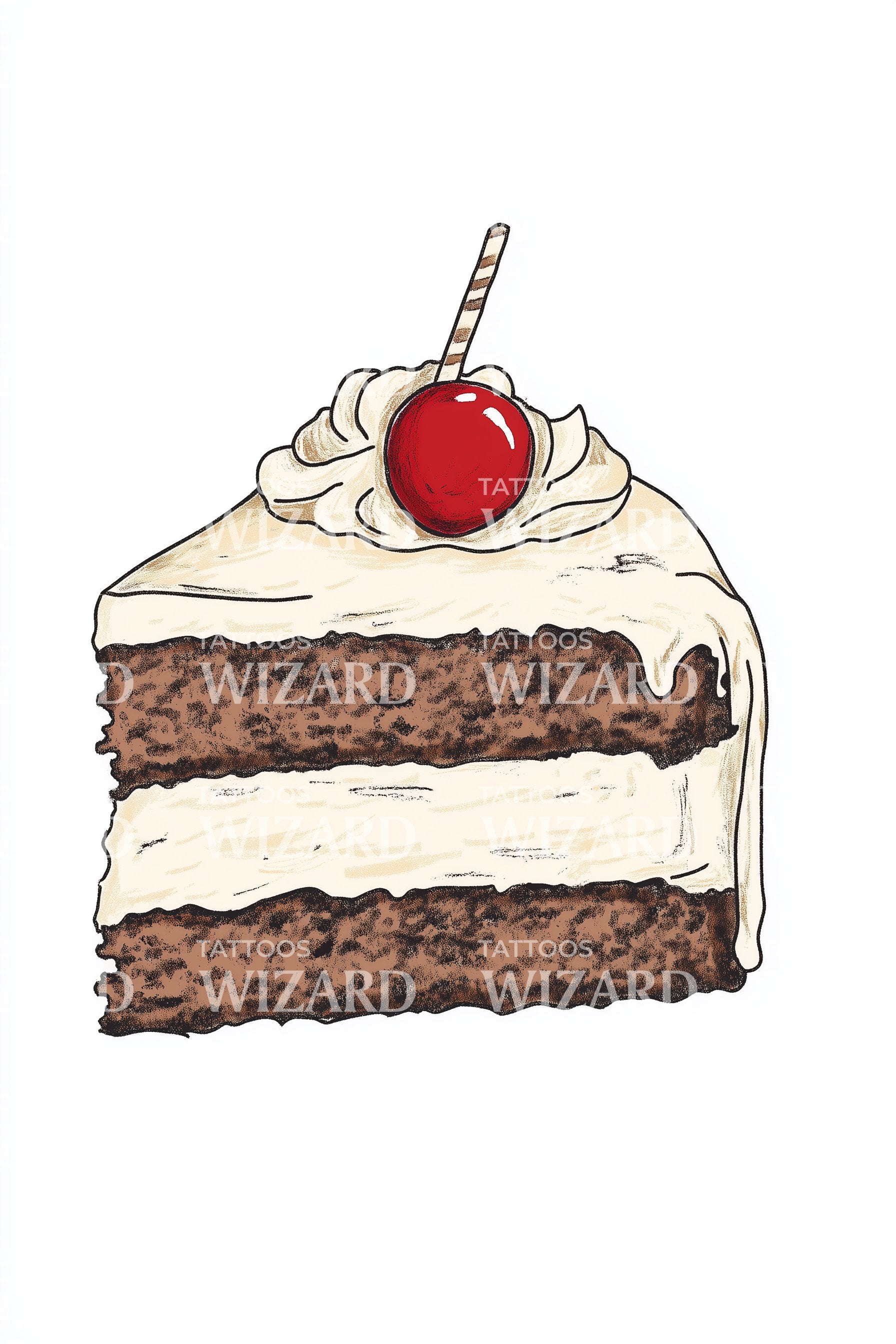 Neotraditional slice rendered with bold lines, creamy highlights, and a lush cherry crowned in whipped swirls. Layered cake and melting cream symbolize savoring milestones, sweetness hard-won, and celebrations kept daily. Wearing it feels indulgent yet sincere, a reminder to honor small desserts of life with joy and wonder.