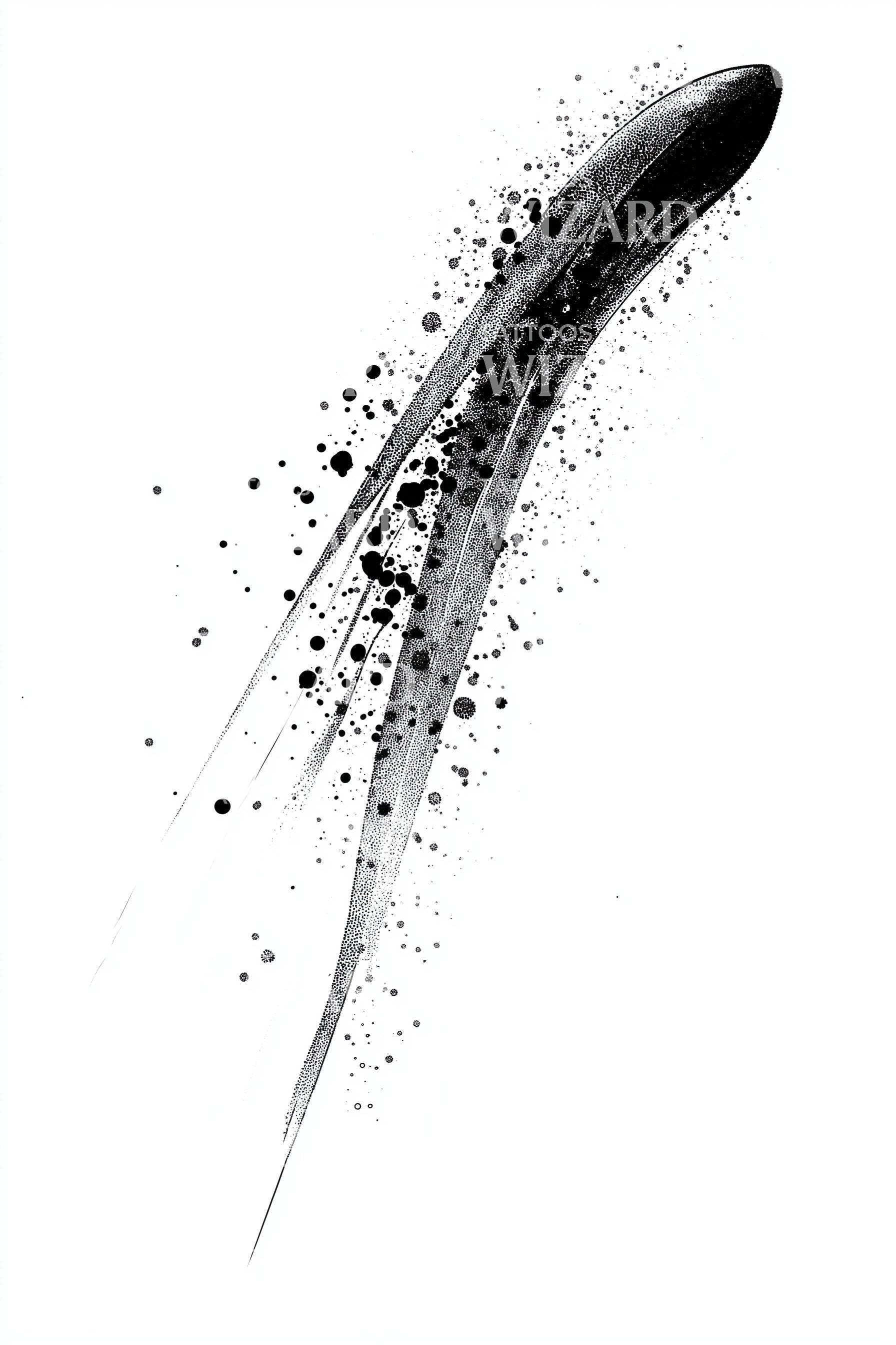 Fineline comet-feather arcs upward, stippled ink scattering like star dust and quill splashes. The sleek sweep suggests velocity and grace, a flight path carved by intention. Symbolizes transformation, guidance, and words becoming journeys. Worn, it feels like momentum on skin, urging brave departures and luminous returns again skyward.