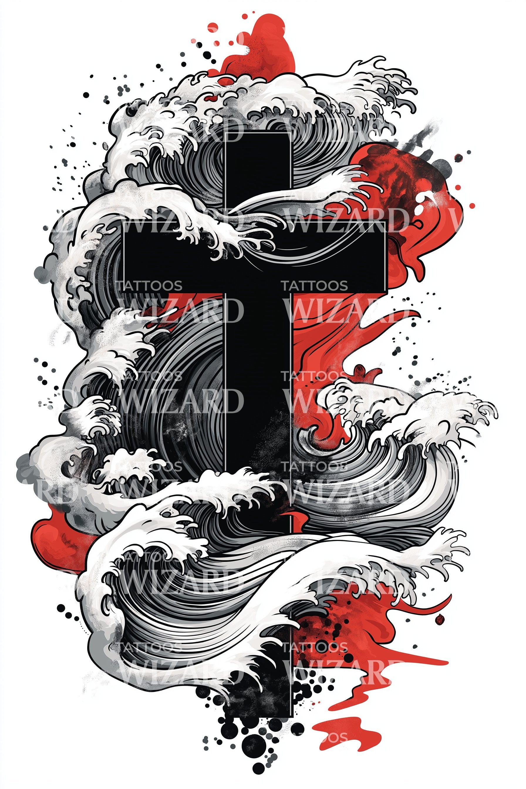 Tenn din tro med dette dramatiske akvarell-tatoveringsdesignet. Det levende karminrøde korset, sømløst blandet med en virvlende bølge, skaper en fantastisk fusjon av farge og symbolikk. Det er mer enn bare en tatovering, det er et uttrykk for utholdenhet og tro.
