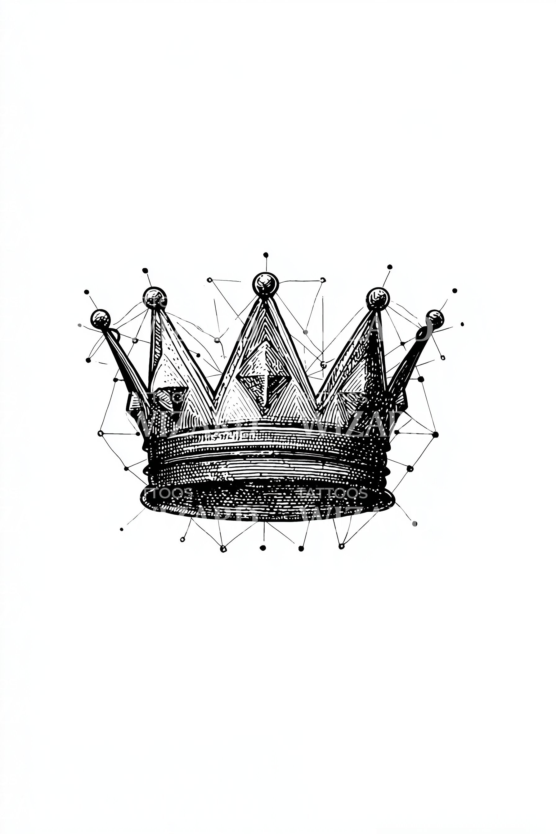 Tilted crown sketched in gritty black linework, ringed by dot-linked geometry, feels worn, defiant, alive. Symbol of earned sovereignty, it honors rule by scars, not ceremony, and the networks we build from rebellion. Worn on skin, it sparks fearless posture, quiet swagger, and uncompromising self-respect, everyday, unshakable grit.