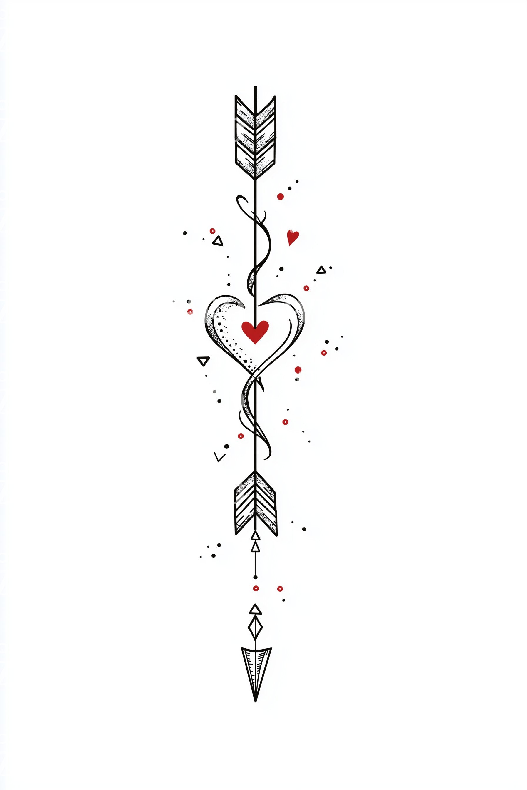 Fineline arrow pierces a dotted heart, ribbon linework spirals the shaft, with delicate dotwork and red accents evoking love and romance. Symbolizes direction led by the heart and enduring devotion. Feels focused, brave, passionate. Ideal on spine for drama, forearm for visibility, sternum for intimacy, calf for sleek flow.