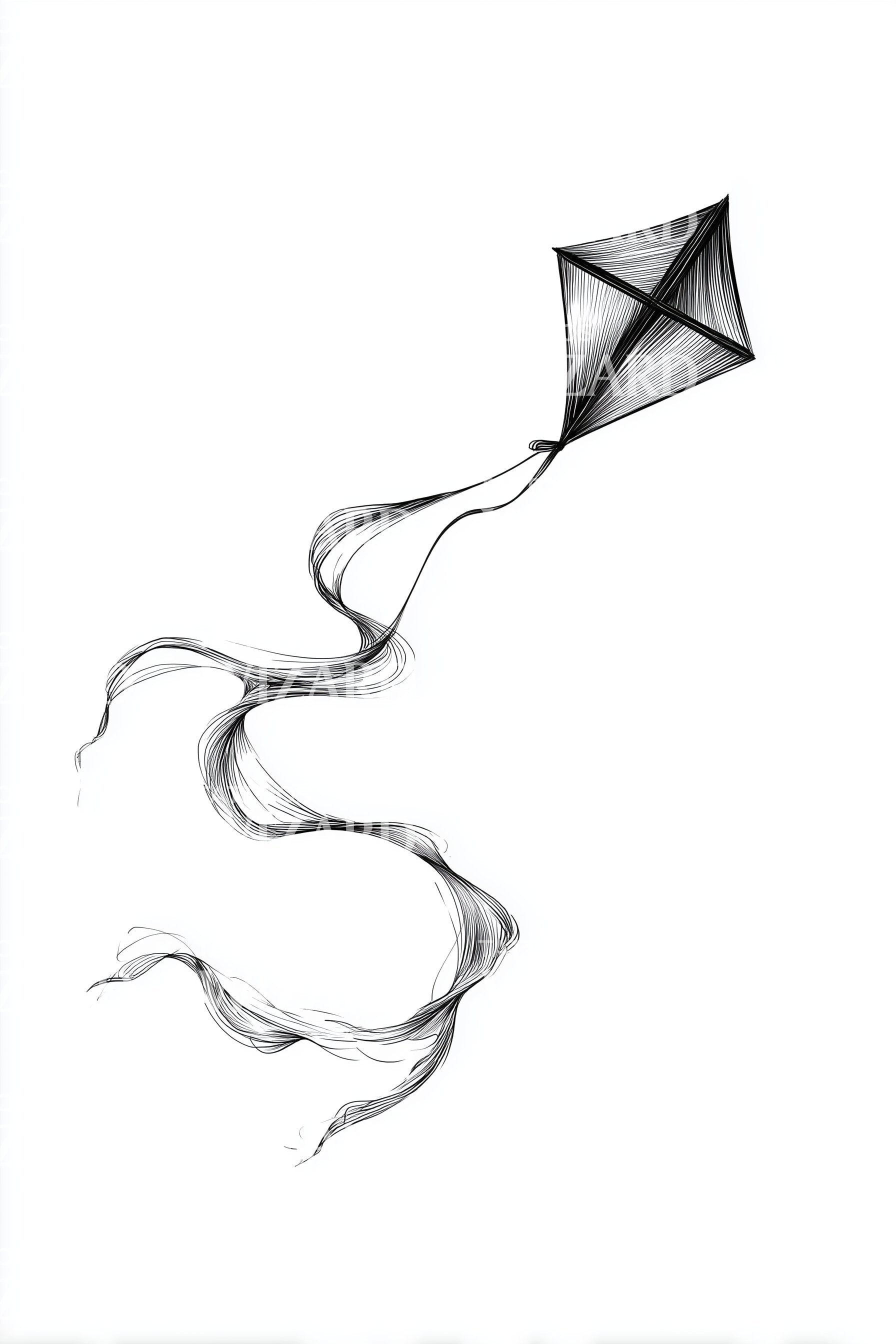 Fine ink lines sketch a wind-kissed kite, its crosshatched body and flowing string drifting toward open sky. This minimalist sketch captures playful motion and the freedom of letting go while staying connected. Wearing it feels like a breeze on skin, a reminder to rise lightly, joyfully.