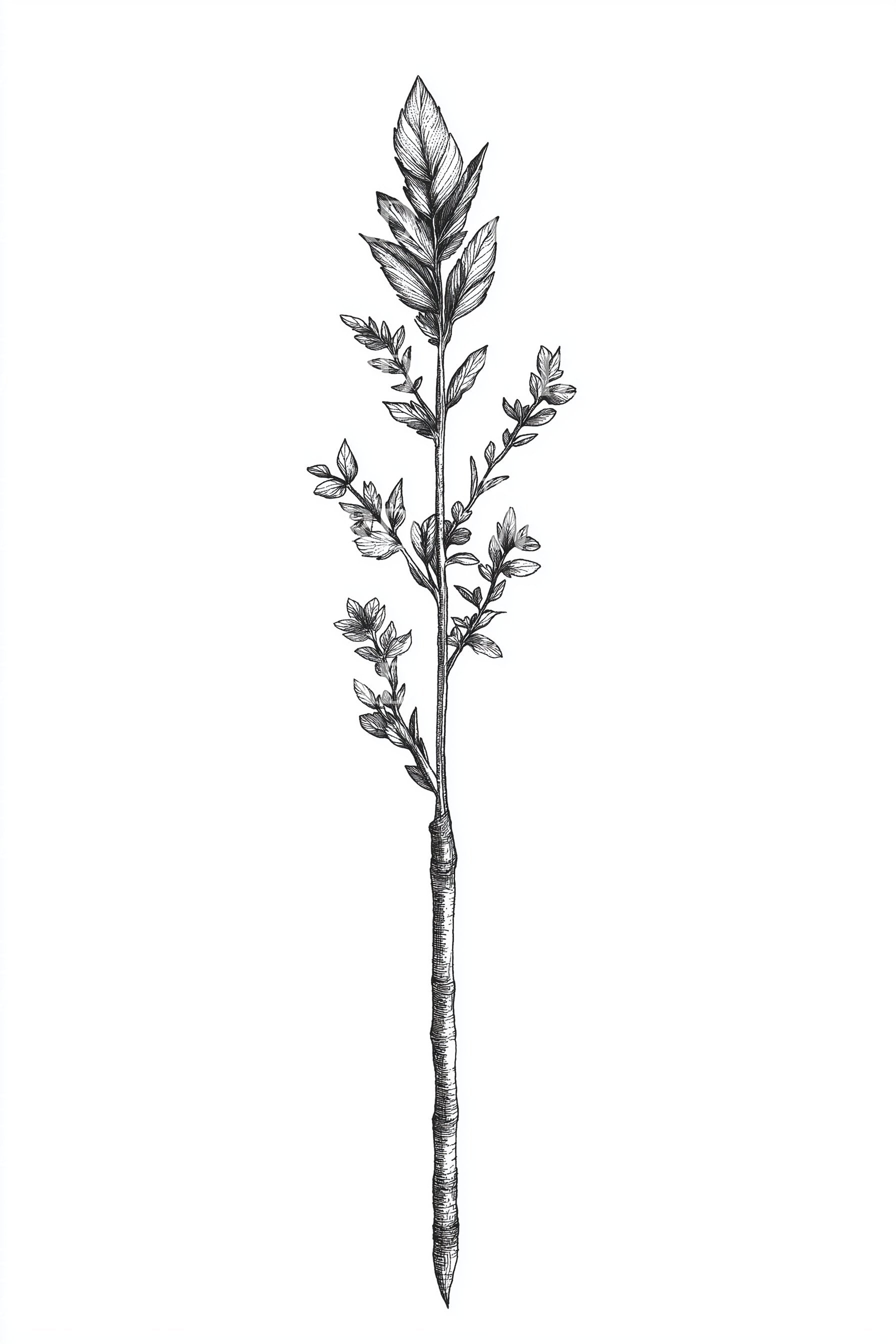 Fineline sprig of laurel rises in crisp black ink, a slender stem with layered leaves and delicate shoots. Symbol of victory, renewal, and grounded grace, it honors quiet strength and growth. Wearing it feels like carrying a calm woodland breath, minimal beauty guiding steady, nature-led intention each day.