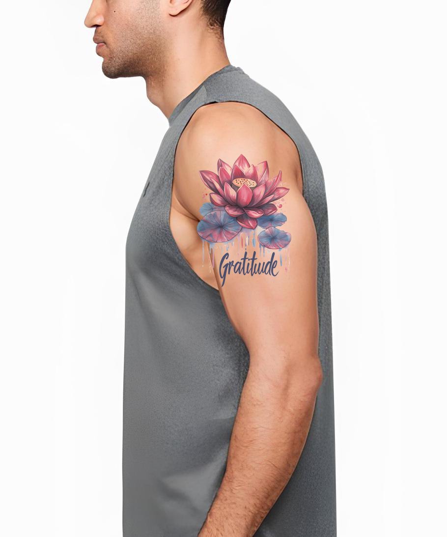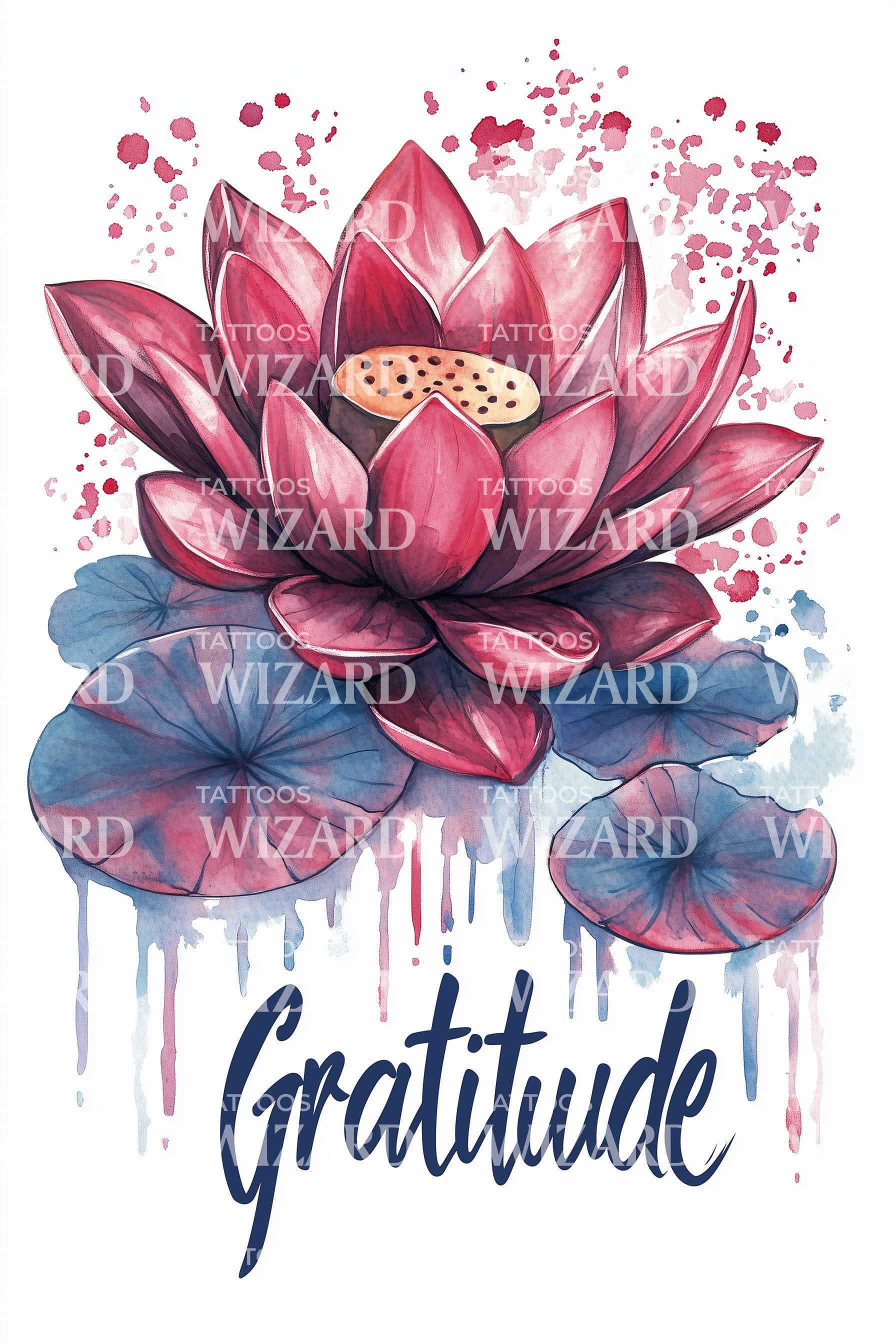 Pink watercolor lotus blooms above blue pads, splashes and soft drips framing Gratitude. Symbolizing renewal from mud, it honors mindful presence and serenity of thankfulness. The wearer feels centered and openhearted. Ideal placements: forearm for vertical flow, sternum for focus, upper back for balance, calf for graceful length.