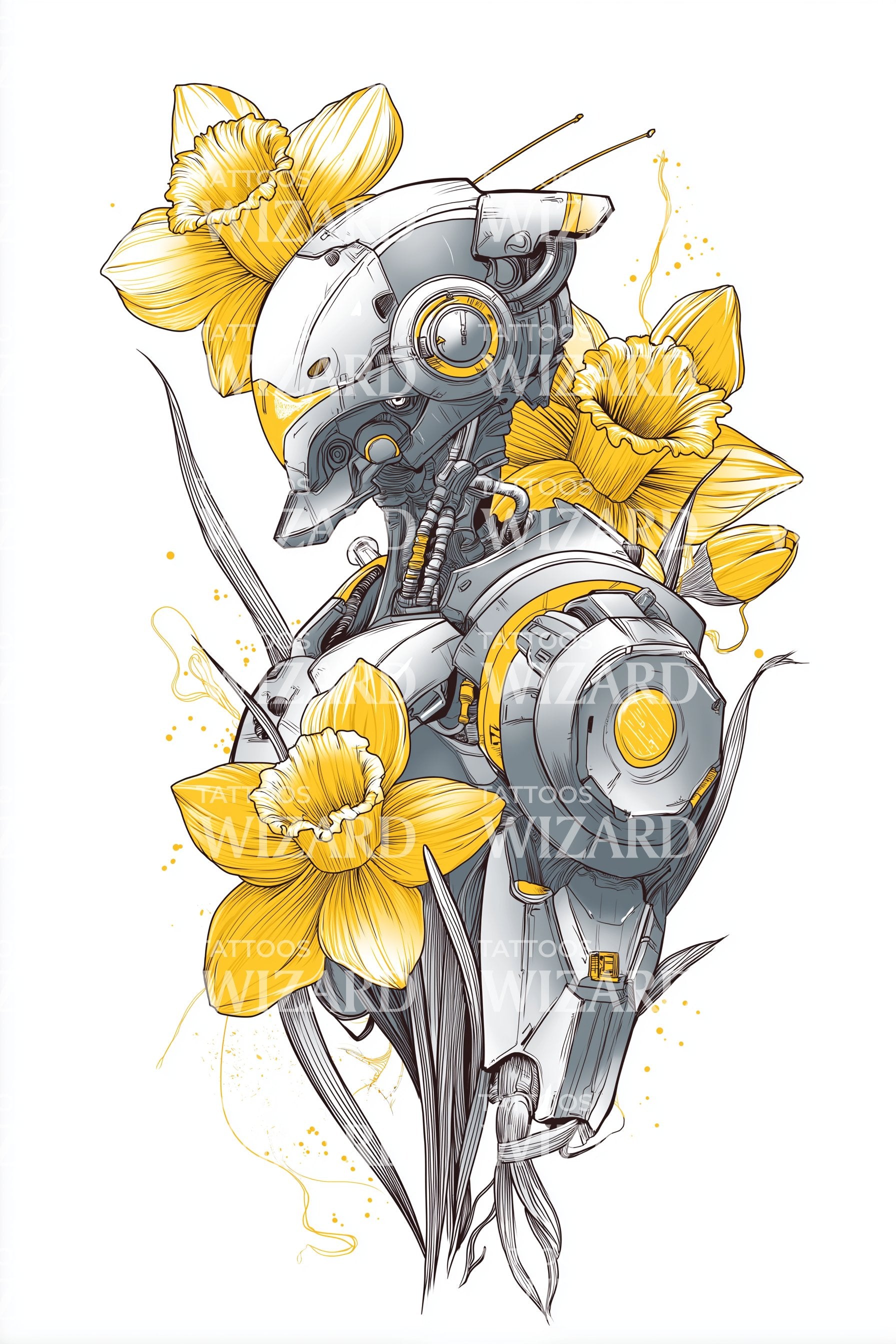Fordyp deg i den unike fusjonen av natur og teknologi med vårt neotradisjonelle tatoveringsdesign. Det kontrasterer vakkert den delikate kompleksiteten i en blomst med robuste, robotiske mecha-elementer. Dette visuelt slående verket blander mesterlig tradisjonelle prinsipper med et friskt, futuristisk preg. Skil deg ut med dette neotradisjonelle mecha-blomst kunstverket.