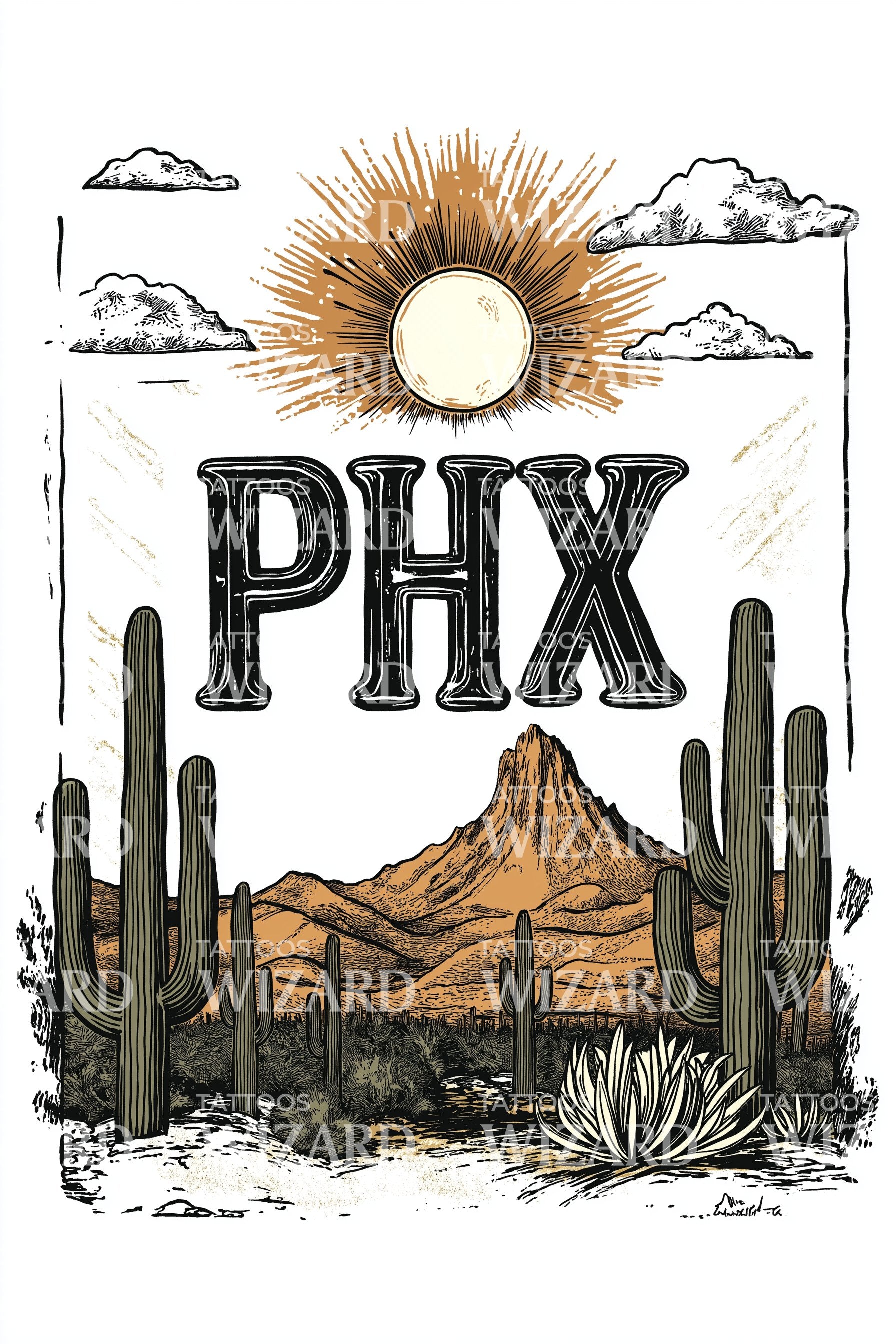 Bold PHX lettering crowns a sunburst sky, towering saguaros, agave, and a rugged mesa carved in desert ochre. Symbols of Phoenix resilience, the cacti stand patient, the sun promises rebirth, the trail invites onward. Wearing it feels grounded, heat-forged, Arizona-hearted, glowing like sunset over Mesa, open and wild.