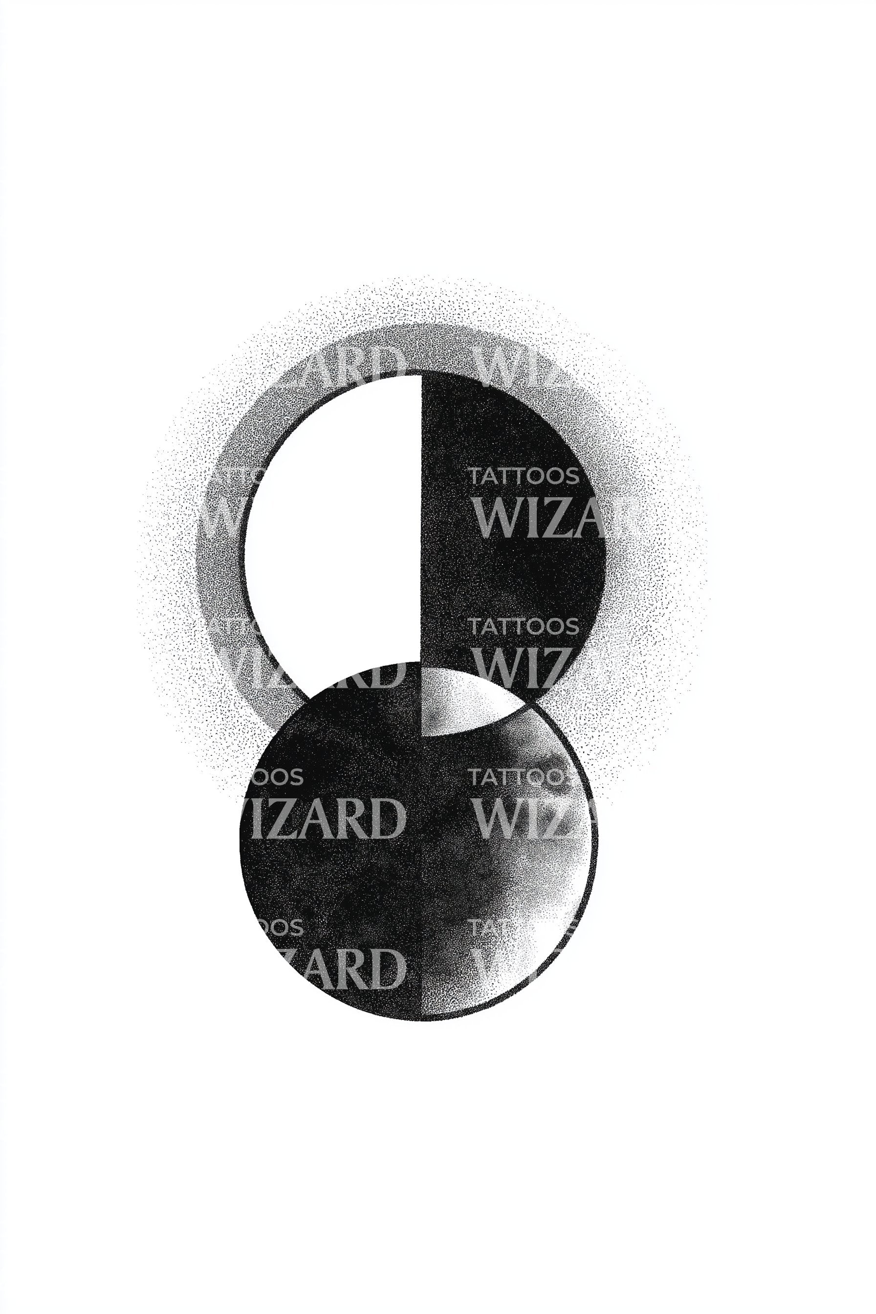 Geometric meditation in pure geometry of two intersecting orbs, rendered in soft stipple, one haloed and cleanly halved, the other revealing a textured quadrant. Symbolizes cycles, choice, and the meeting of light and shadow. Worn on skin, it centers the heart, inviting steady balance and mindful direction.