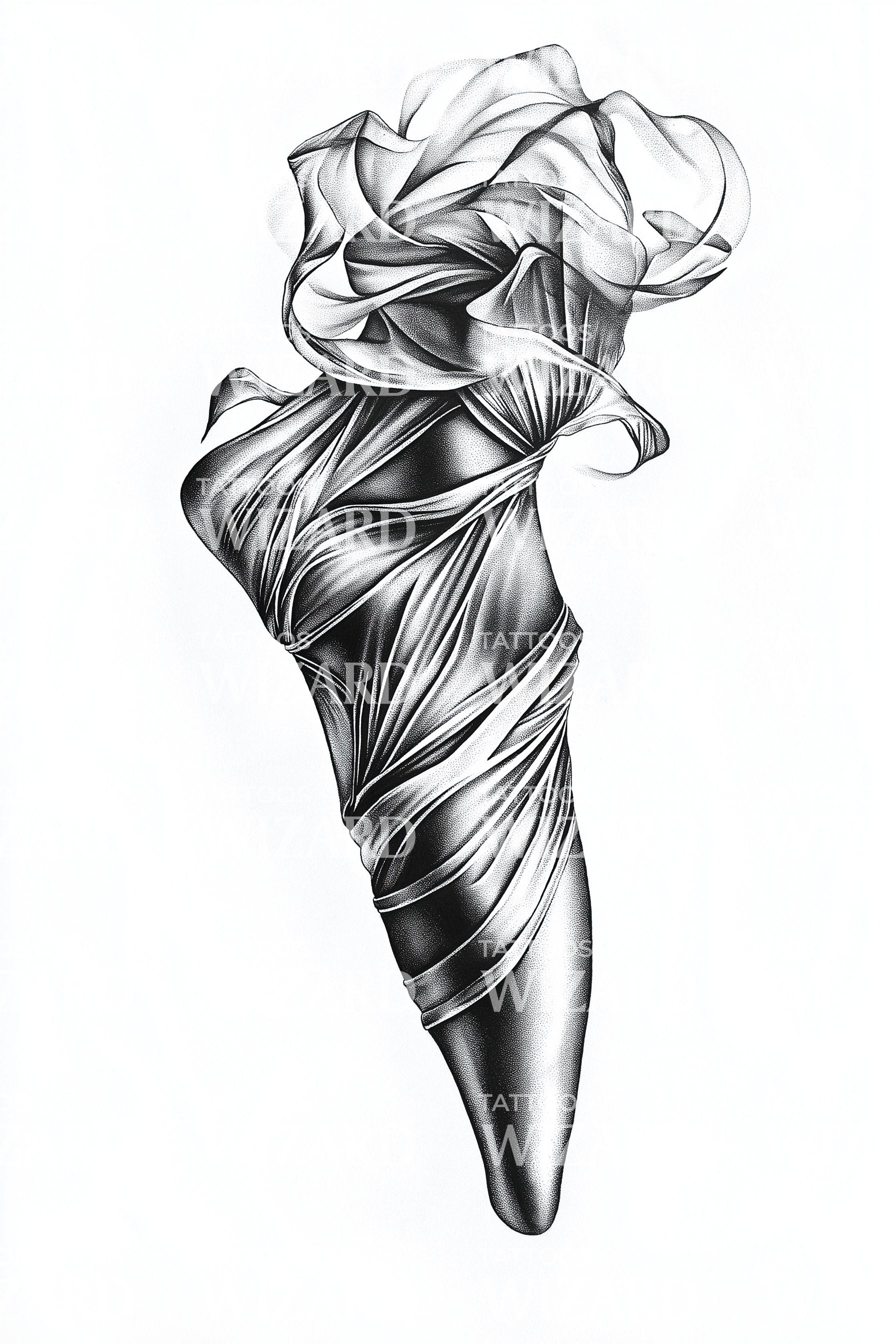 Graphite-soft lines sketch a flowing ribbon that twists around a sculpted form, drifting like fabric caught mid-breath. Shadowed dotwork carves depth and movement. This abstract wrap symbolizes transformation, restraint becoming release. Wearing it feels poised yet untethered, a quiet surge of grace, resilience, and forward momentum.