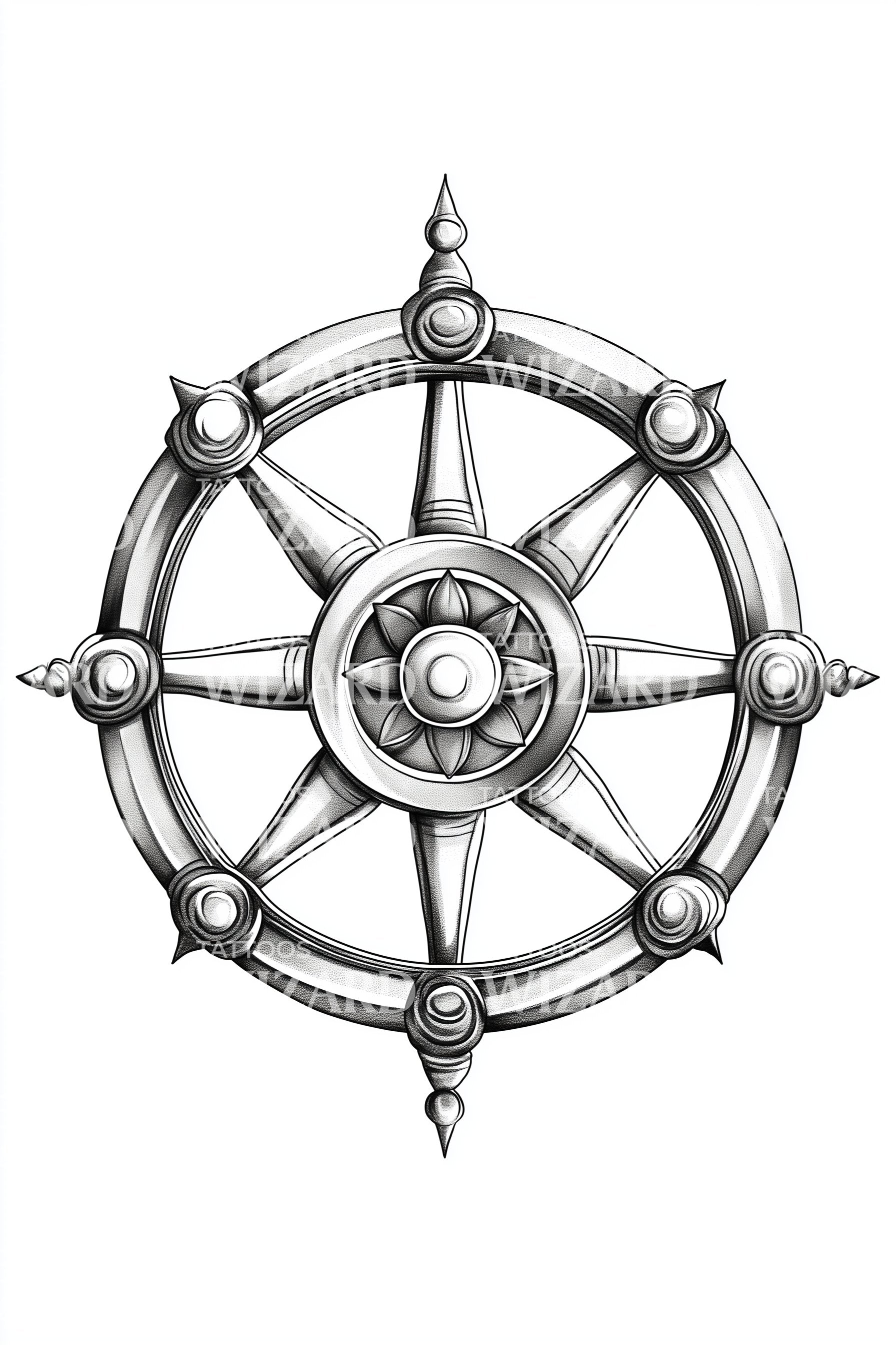 Naviger livets farvann med dette realistiske tatoveringsdesignet! Gjennomsyret av nautisk sjarm, viser dette motivet et skipsratt som symboliserer kontroll og retning. Nøye detaljert er rattet bevisst utformet for å fremkalle følelsen av et ekte skipsstyringshjul. Et absolutt must for sjøentusiaster og tatoveringssamler.