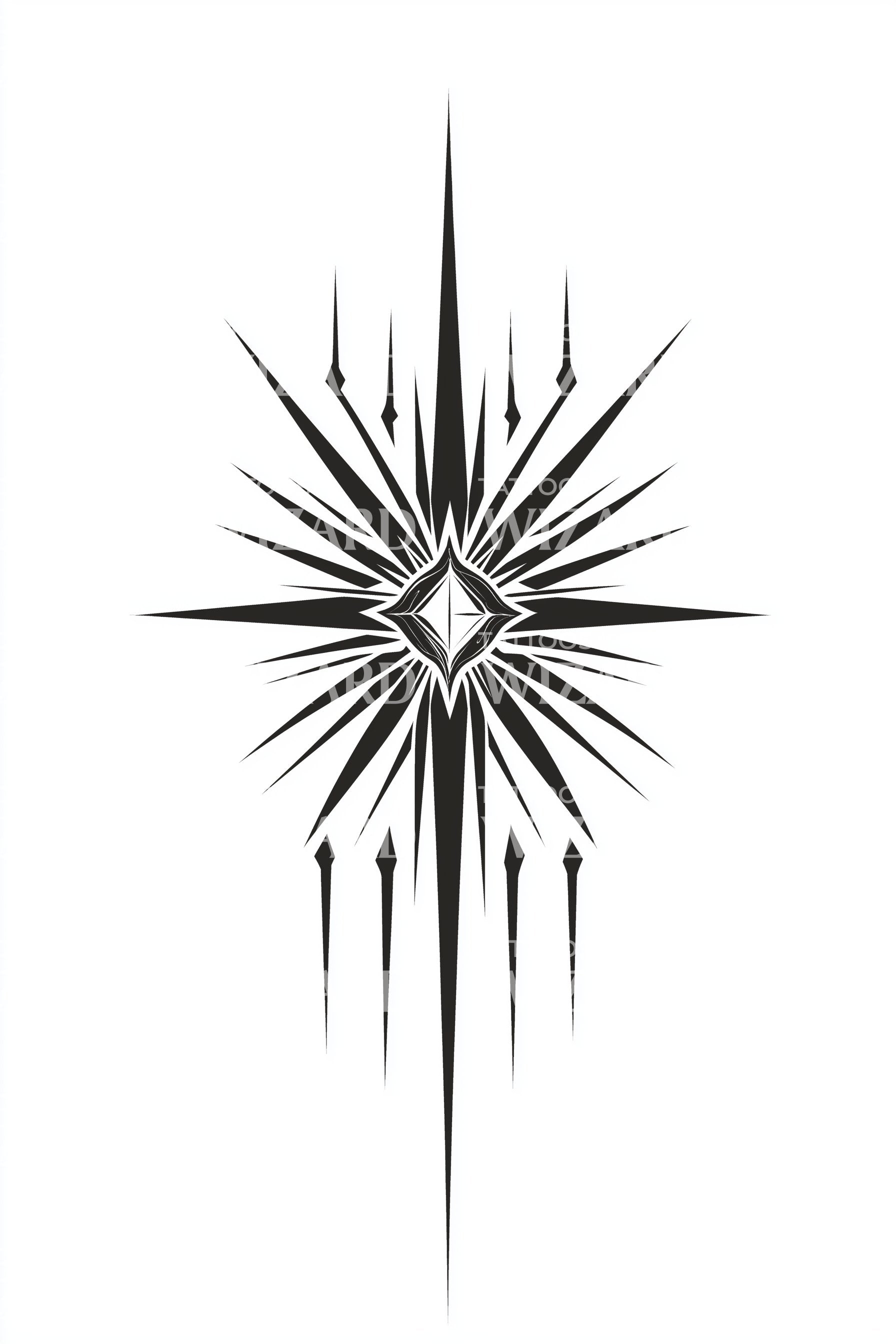 Blackwork starburst erupts from a diamond core, sending razor spikes outward in bold contrast. Abstract spears frame a luminous center, echoing ignition, focus, and guarded light. Worn on skin, it feels like a vow to cut through noise, stand sharp, and radiate uncompromised clarity, strength, direction, purpose, resilience.