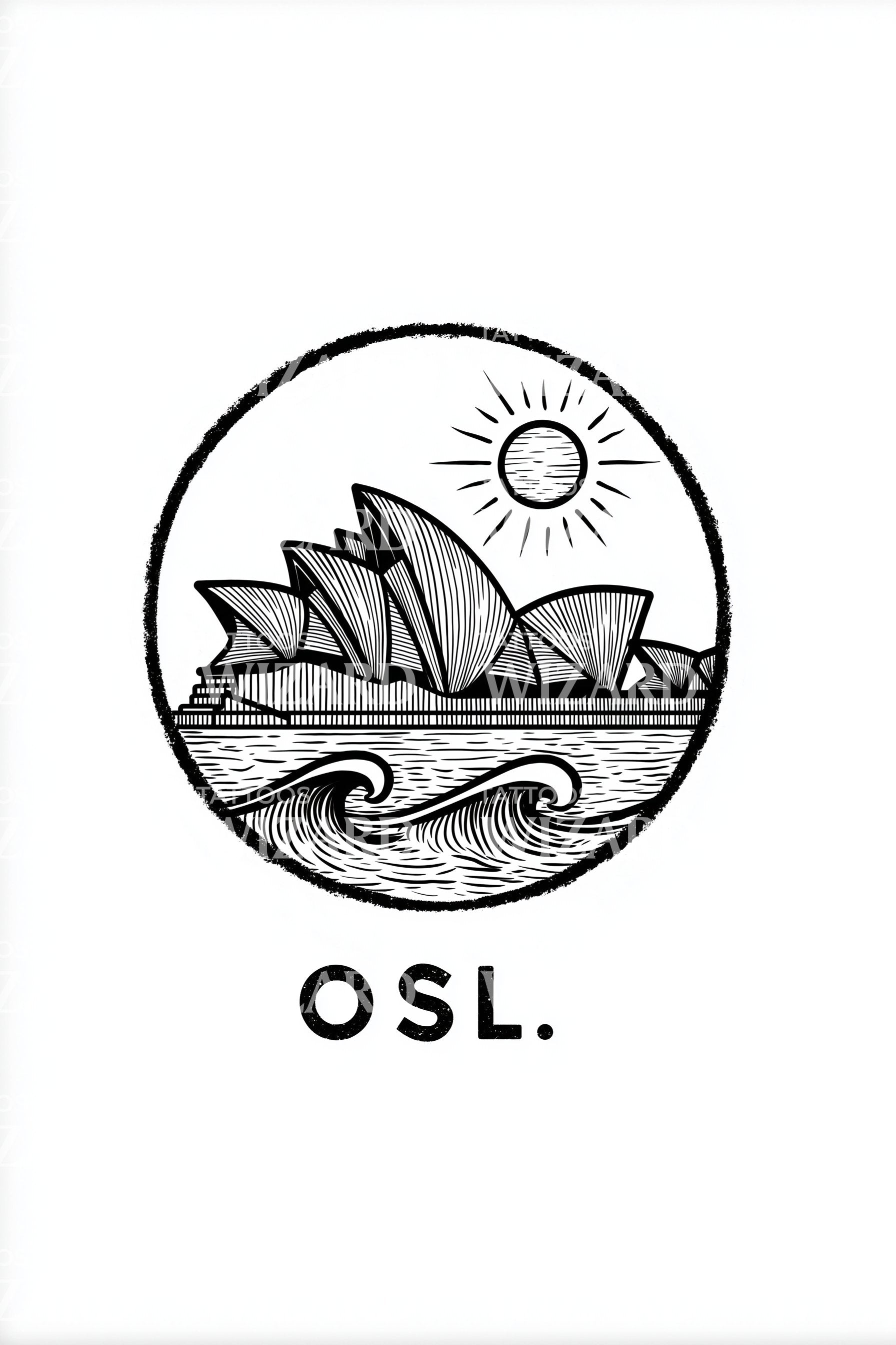 Hand-drawn circle frames a crisp black ink seascape: rising sun, curling waves, and saillike roofs that echo boats moored in Oslo’s harbor, marked OSL. Symbolizing new departures and northern light, the piece honors Scandinavian calm and courage. Wearing it feels clear, seaworthy, and unstoppable. Guides daily journeys home.