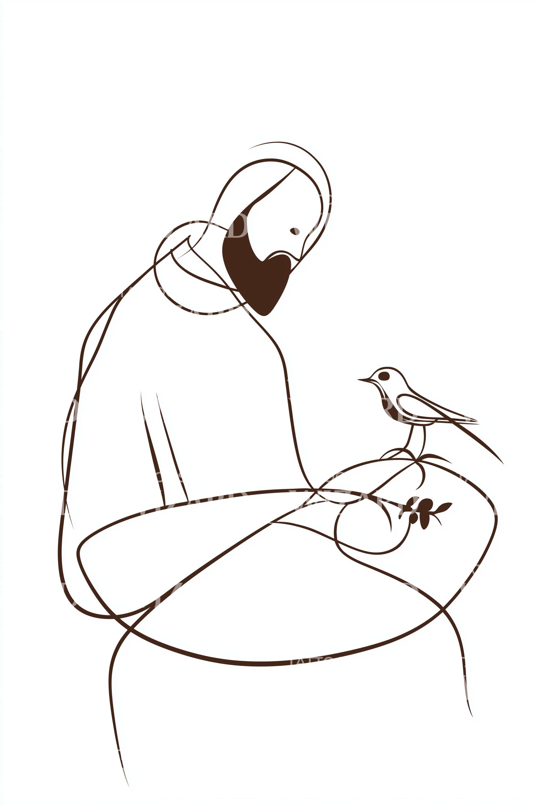 Poczuj istotę pokory i wiary dzięki naszemu wzorowi tatuażu 'Francis'. Ten misterny fineline przedstawia mnicha i ptaka w wyrafinowanym rysunku, pięknie ukazując harmonijne współistnienie natury i duchowości. Noś swoją wiarę na ramieniu, z tym skromnym, lecz głębokim symbolem.