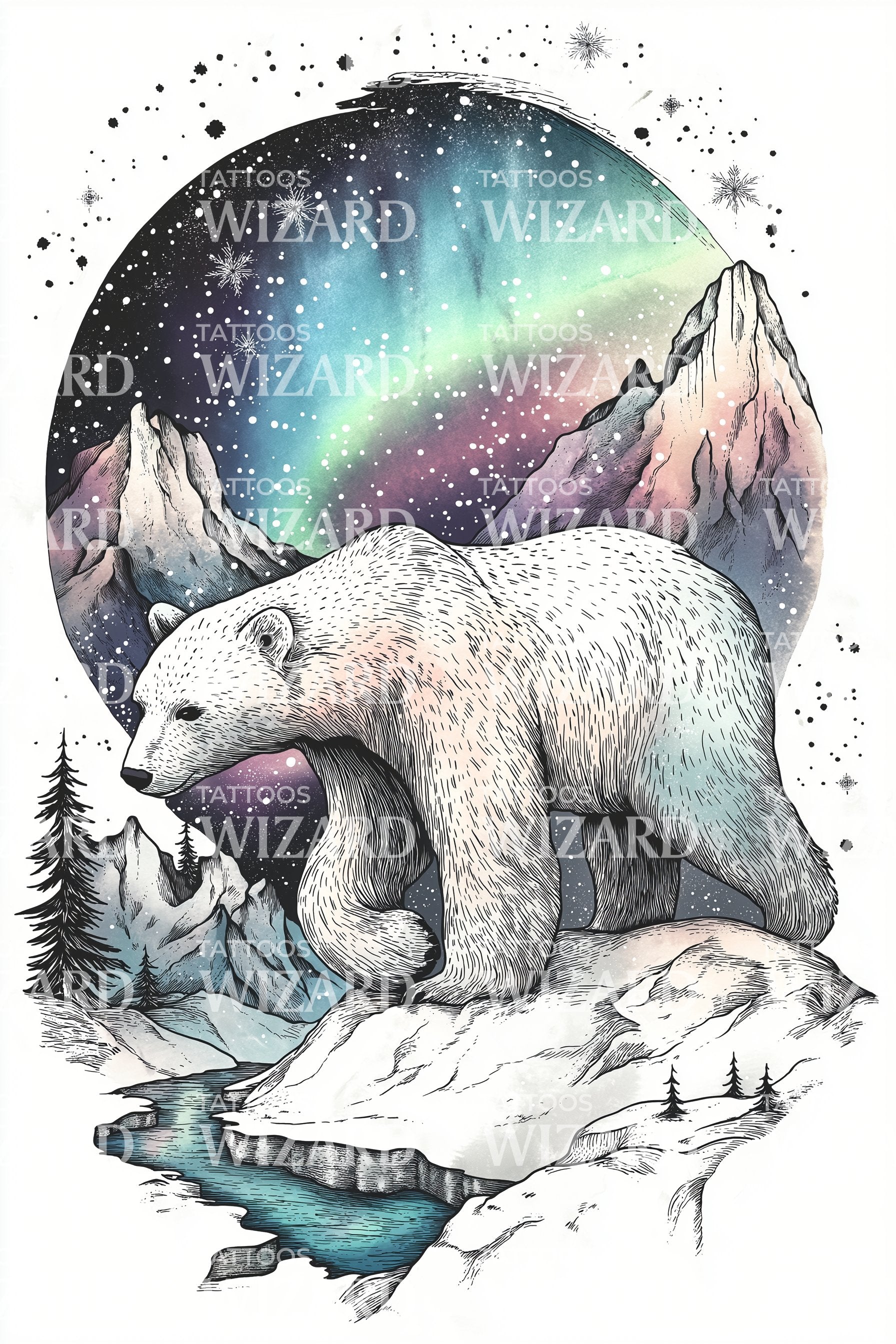 Glacial watercolor swirls frame a steadfast polar bear beneath an aurora, icy mountains rising and a turquoise river carving light. Each element speaks resilience, guidance, and quiet power, the northern sky blessing change. Wearing it feels brave, grounded, and luminous, a personal compass painted in living color.