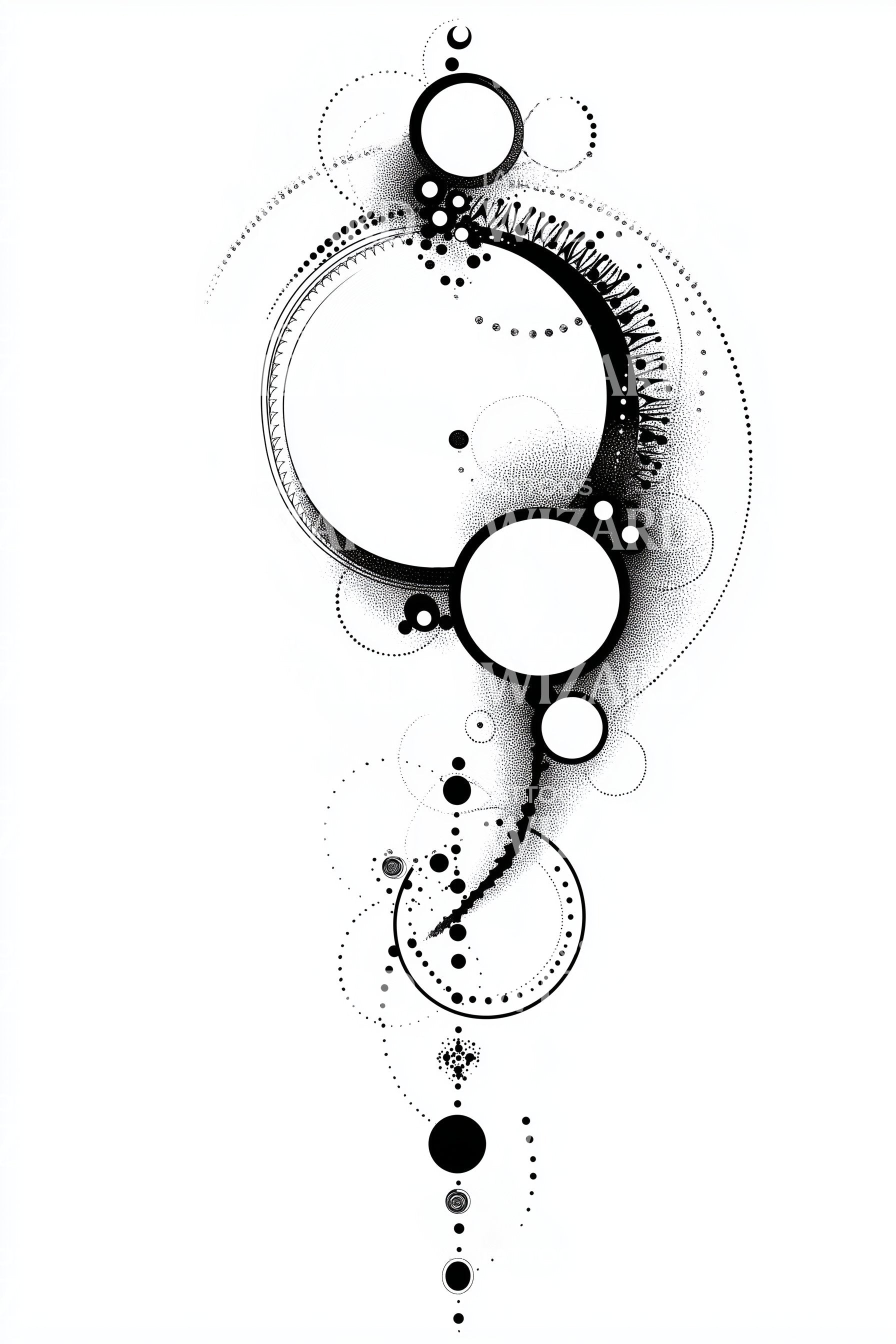 Zanurz się w kosmicznym zachwycie dzięki naszemu geometrycznemu wzorowi tatuażu. Reprezentuje on niebiańską elegancję, ściśle łącząc się z uniwersalnymi koncepcjami yin, orbity i przepływu. Wykwintne wzory spiralne emanują mistycznym urokiem, pięknie oddając istotę kosmicznej nieskończoności. Idealny dla tych, którzy są zafascynowani ciałami niebieskimi i kosmicznymi tajemnicami.
