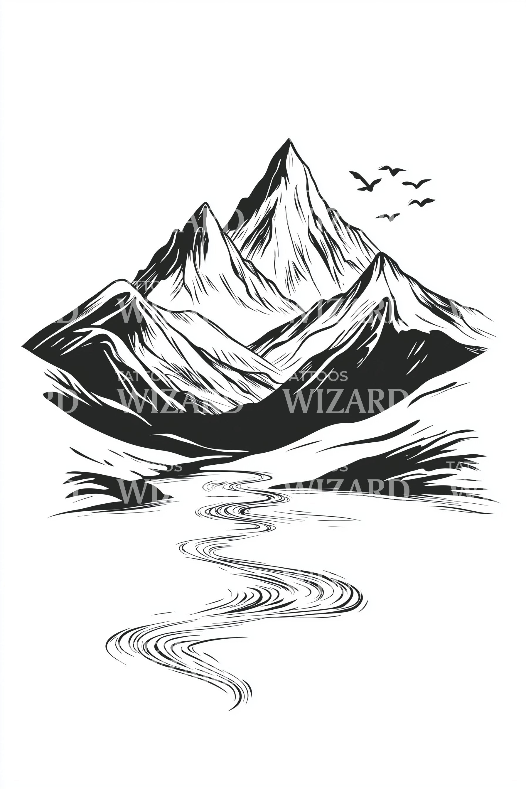 Zanurz się w pięknie dziewiczej dziczy dzięki temu ilustracyjnemu projektowi tatuażu. Artystycznie ukazuje oszałamiający górski krajobraz przecięty wijącą się rzeką. Aspekt odbicia w projekcie dodaje głębi i zachwytu, prawdziwie oddając surową ciszę nieokiełznanej natury. Idealny wzór dla tych, którzy mają dzikie serce.