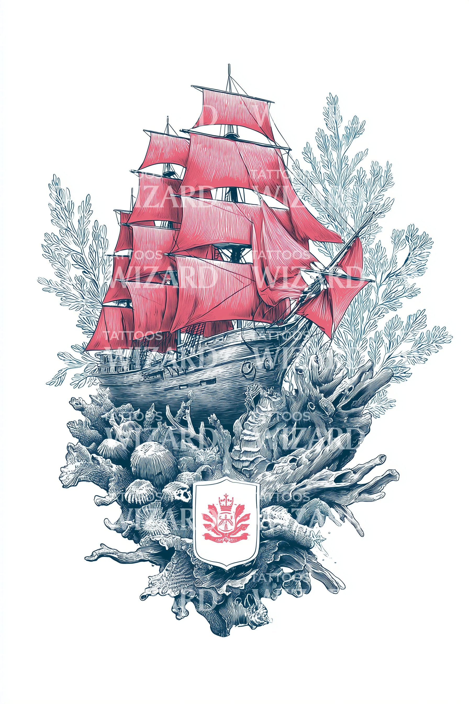 Ilustracja tatuażu czerwonego wysokiego żaglowca