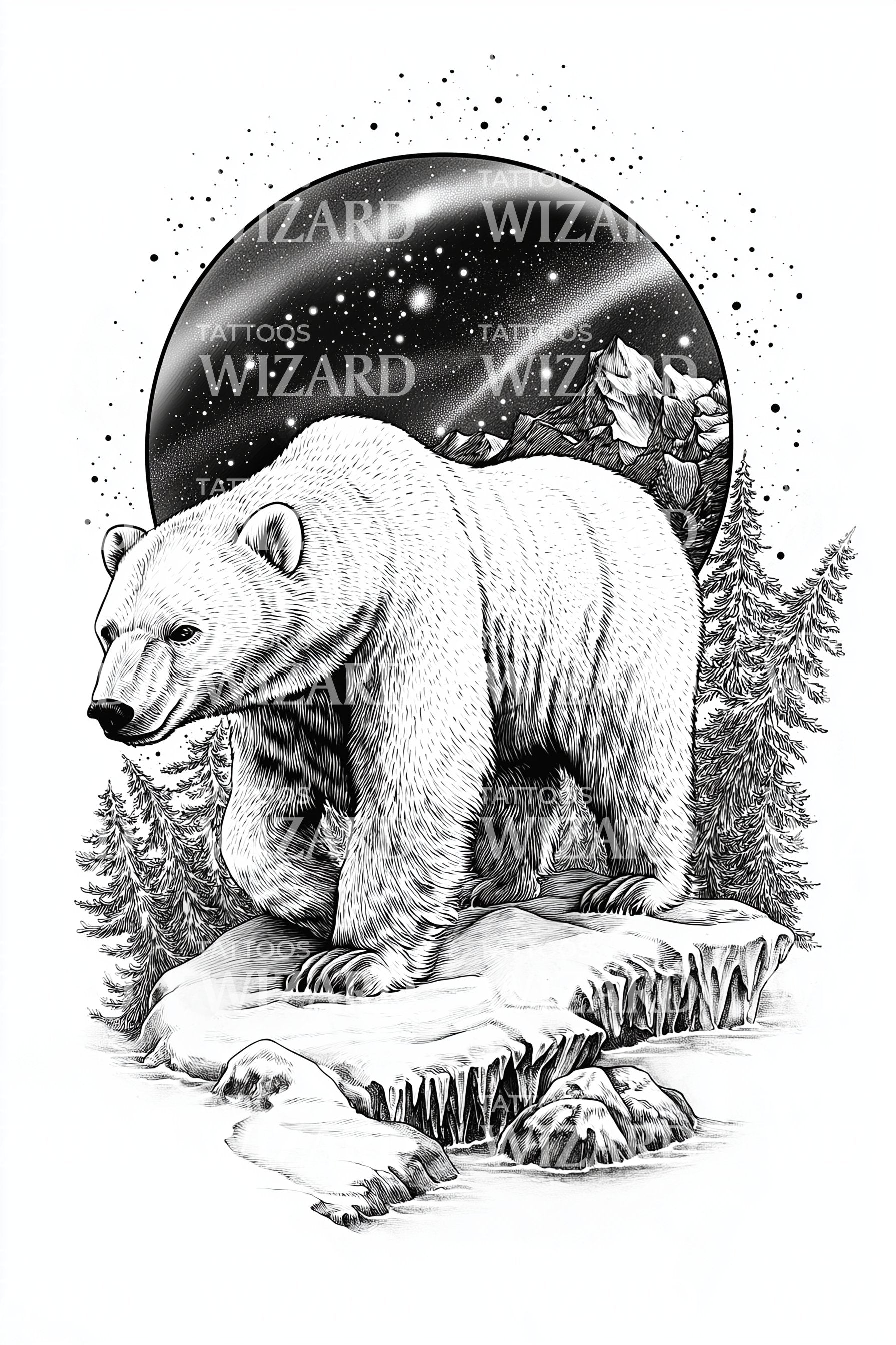 Arctic realism unfolds: a meticulously rendered polar bear stands on icy rock, framed by a pine forest, mountains, and a star-swept night. Symbol of endurance and guardianship, it carries northern wisdom through darkness. Wearing this piece invites grounded courage, serene strength, and deep kinship with Arctic wildlife.