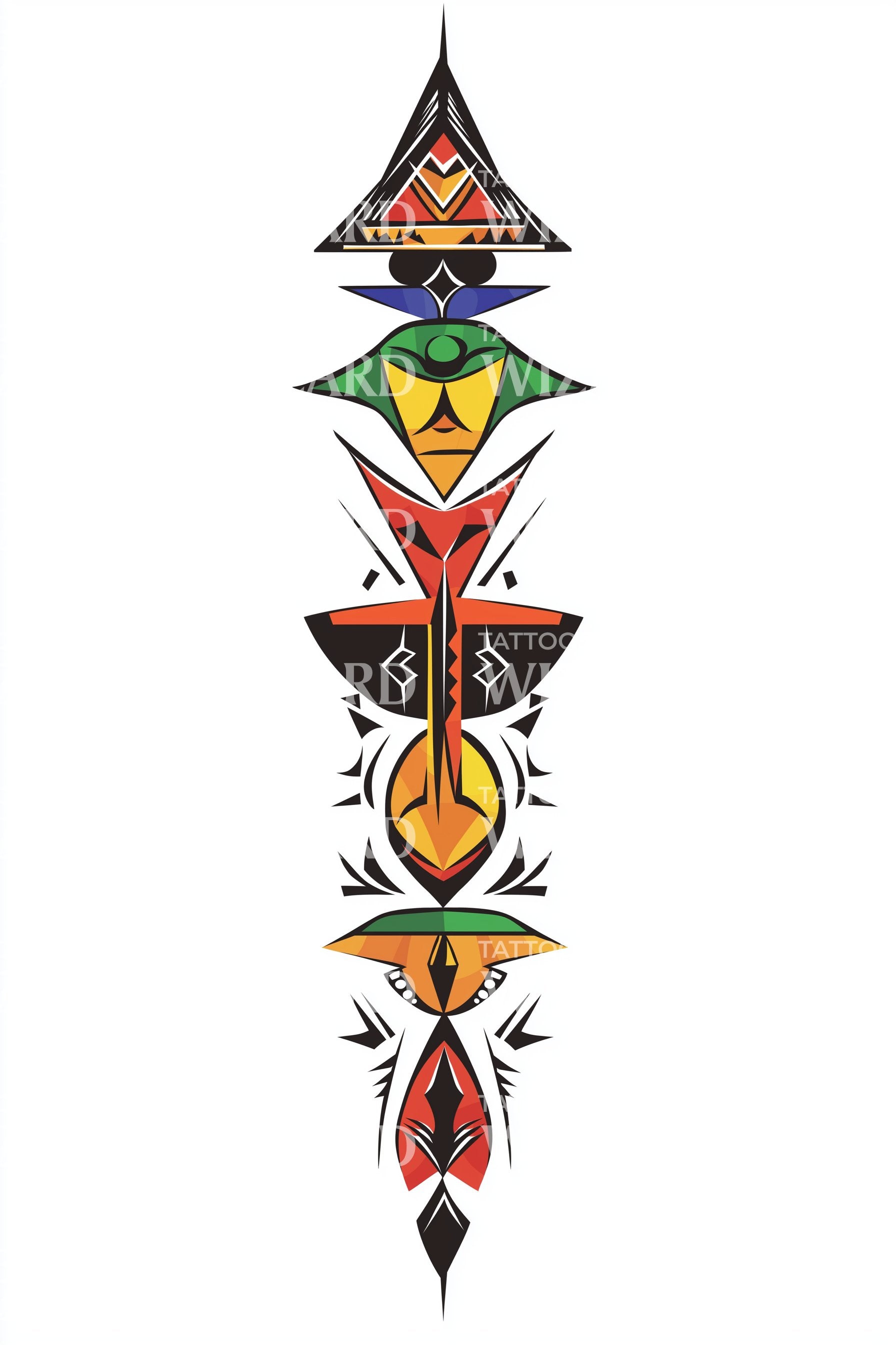Embrace your warrior spirit with this tribal tattoo design. Featuring ethnic, vertical arrows forming a picturesque totem, this artwork echoes deep tribal roots. The vibrant colors incorporated bring a unique touch to the design, making it the perfect choice for those wanting to stand out.