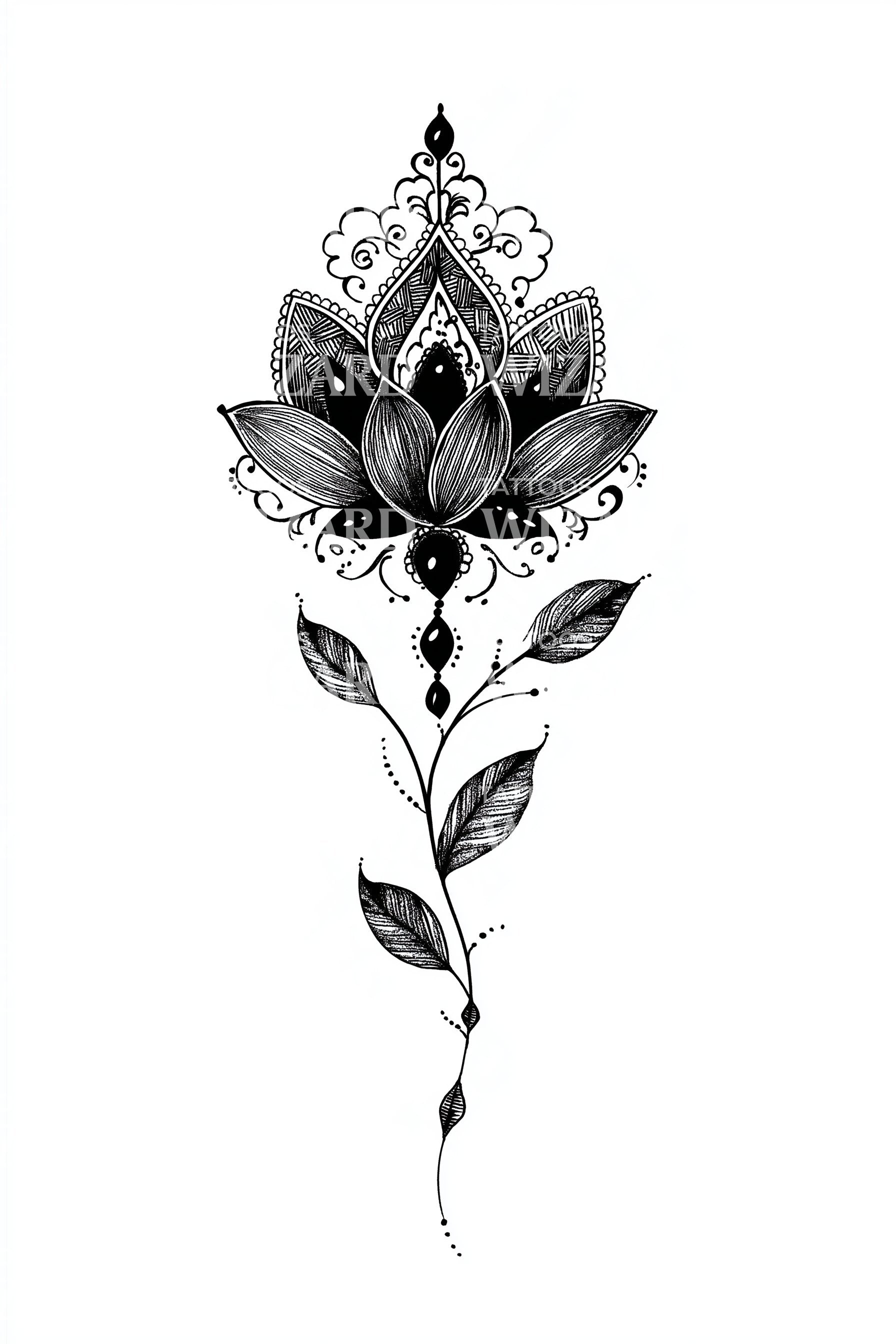 Experience exquisite artistic expression with our ornamental tattoo design. Featuring delicate filigree elements, replete with intricate Baroque motifs, it's truly a feast for the eyes. This piece masterfully intertwines a stunning lotus blossom with an elegant stem, offering a perfect blend of complexity and simplistic beauty.