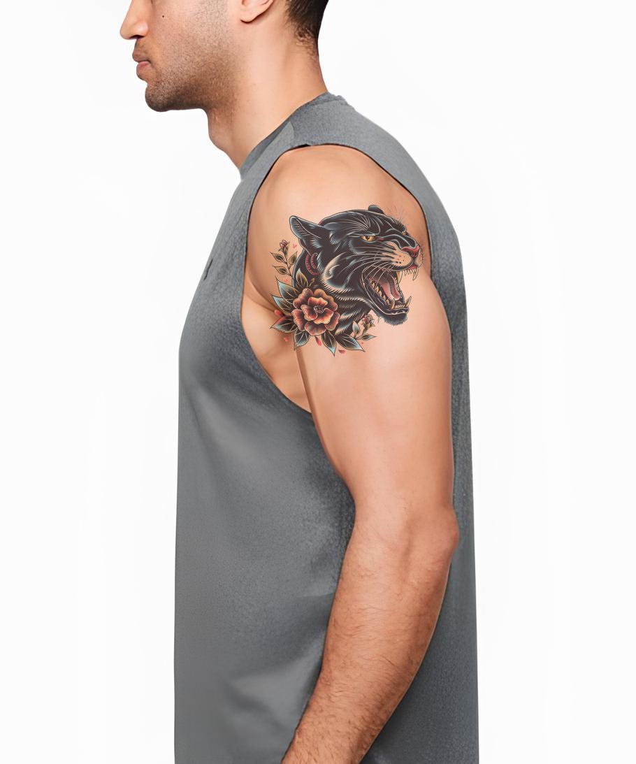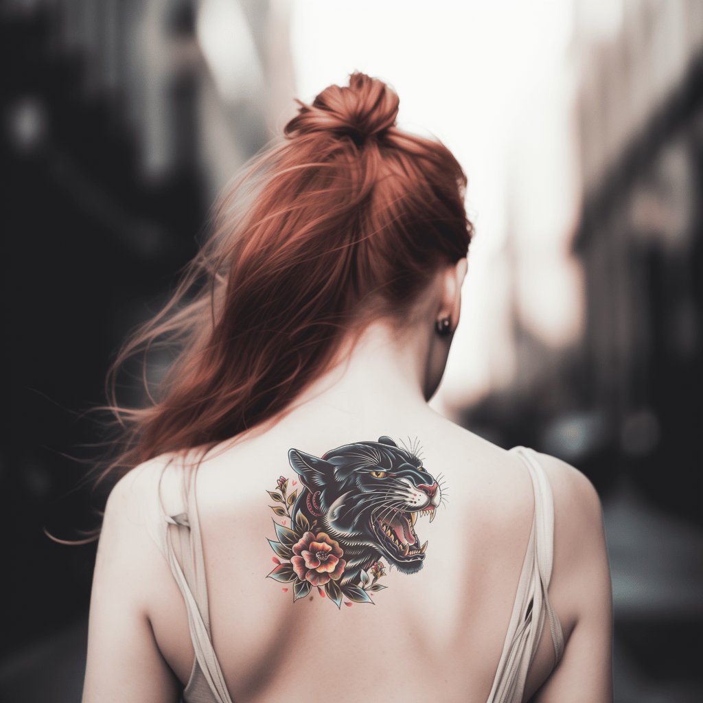 Fierce Panther and Roses Oldschool Tattoo Design