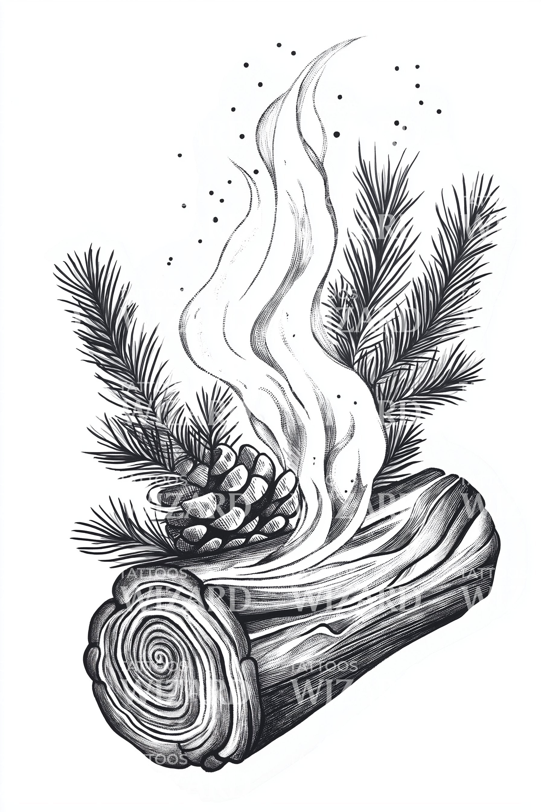 Carved lines and soft stippling shape a Yule log, pine boughs, and a pinecone, lifting smoke into starry flecks. Winter’s hearth glows here, a charm of endurance and renewal, evergreen life amid cold. Wearing it feels like carrying quiet firelight, rooted strength, and a gentle, protective hush.