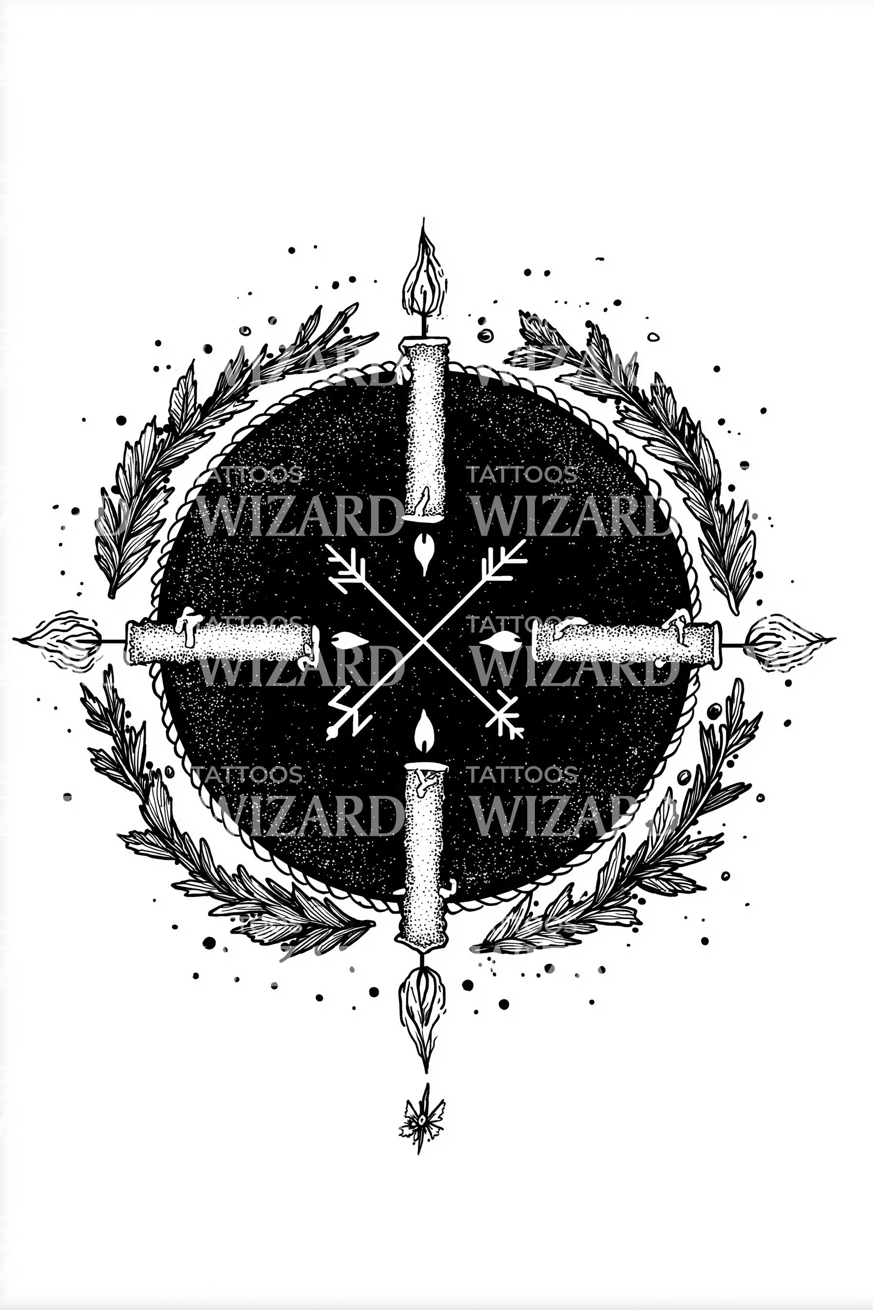 Blackwork sigil circles a starless disc, four dripping candles marking the compass within, arrows crossing like runes. Laurel wreath and scattered embers frame the rite. Candles guard thresholds, arrows guide direction, wreath vows renewal. Worn on skin, it feels grounded, protective, quietly occult, a steadying personal ritual.