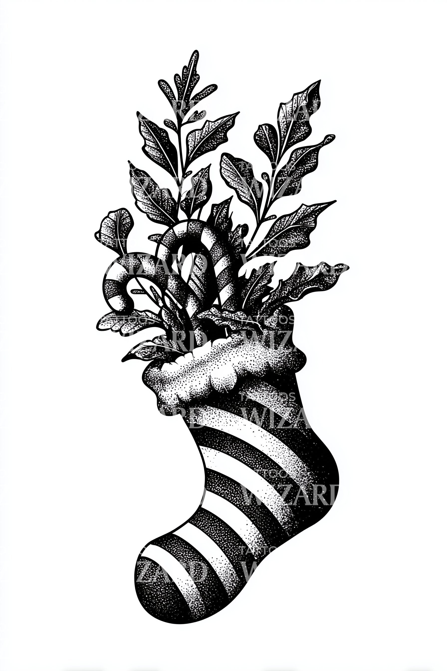 Striped stocking rendered in delicate dotwork, plush cuff overflowing with candycane curves and crisp holly. Traditional christmas icon reimagined as a keepsake of generosity, warmth, and small miracles. Worn close, it feels like a hearth’s glow and childlike wonder, inviting giving hearts and evergreen hope all season.
