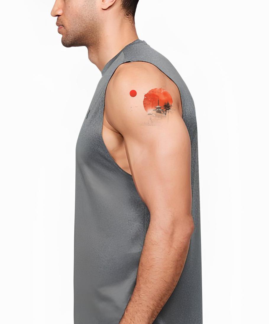 Immerse in the mystical allure of the Orient with this black & grey tattoo design. Featuring a beautiful Chinese pagoda amidst a stunning red sunset, this piece channels the awe-inspiring beauty of a sunrise in China. Crafted meticulously with quality ink, it captures the tranquil essence of Eastern culture.