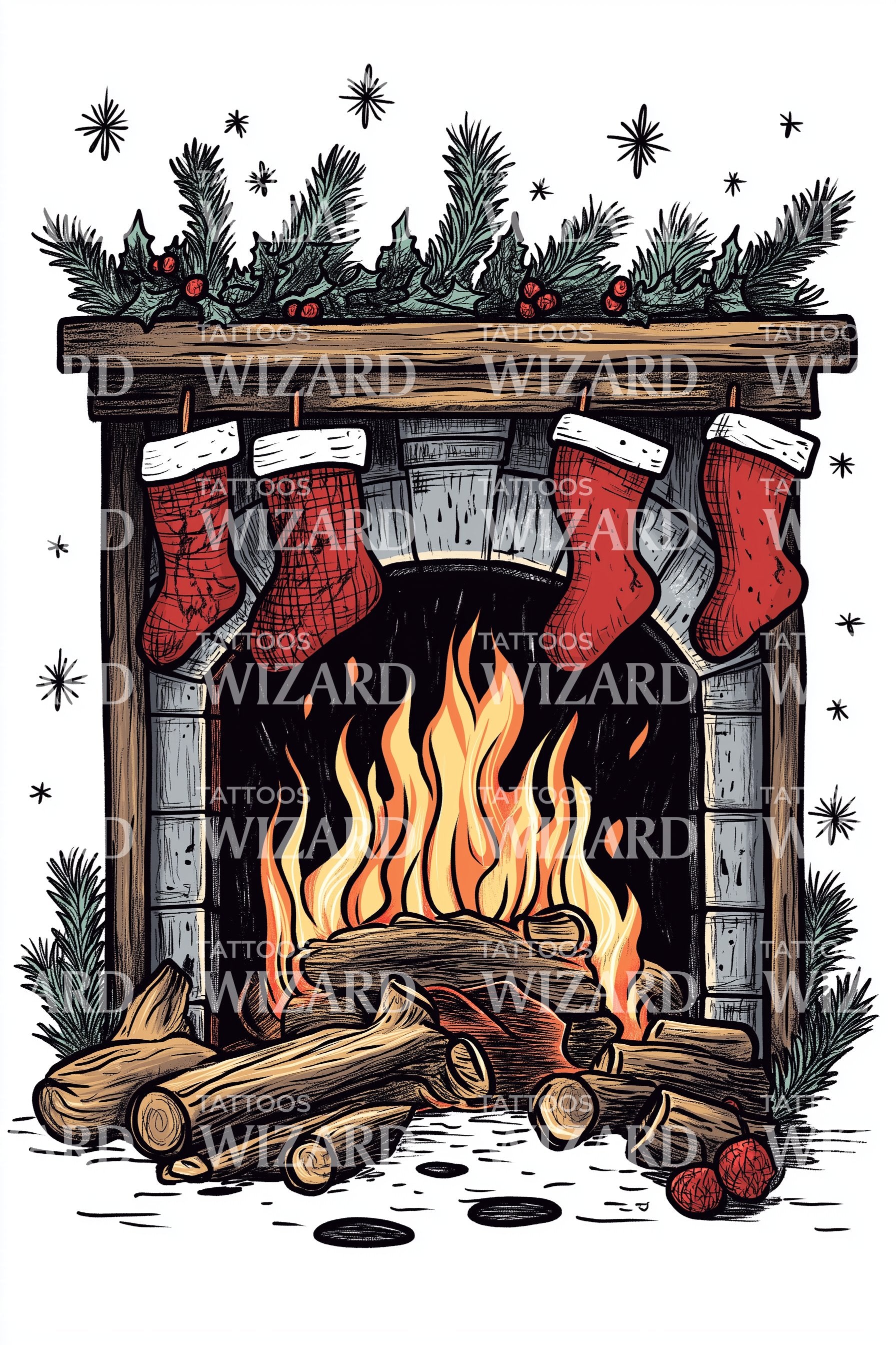 Hearth-lit nostalgia in neotraditional style, with bold outlines, textured woodgrain, holly-trimmed mantle, and ember-gold flames beneath classic red stockings. Logs symbolize fuel for hope; the fireplace becomes a sanctuary of family stories and Christmas wishes. Wearing it feels cozy and grounded, a warm vow to keep traditions burning bright.