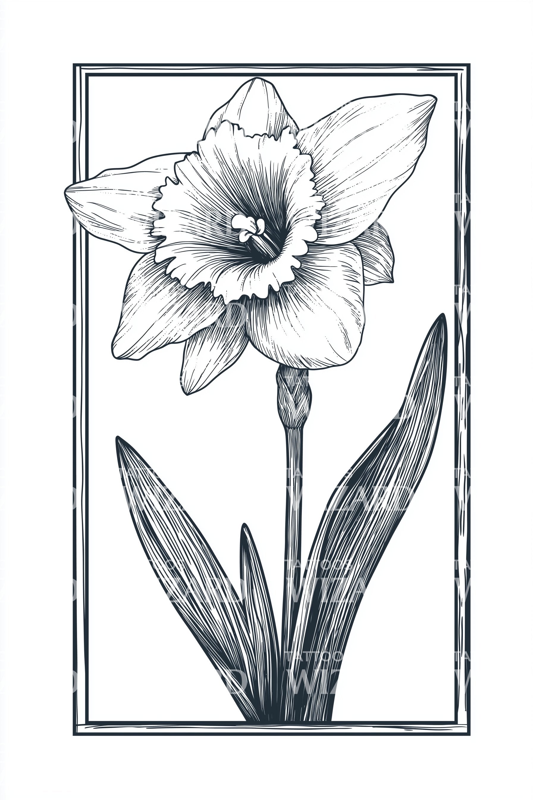 Immerse yourself in nature's elegance with our classical, fineline daffodil tattoo design. Enclosed within a tastefully intricate frame, this botanical piece showcases delicate precision, making the daffodil's timeless beauty stand out. A perfect choice for those seeking a harmonious blend of classic and contemporary aesthetic.
