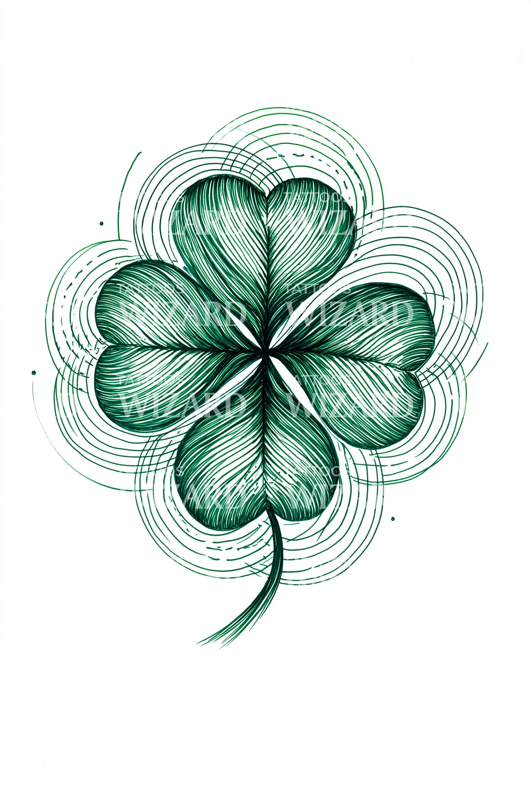 Embrace modern minimalism with this geometric clover tattoo, where crisp lines weave into a hypnotic spiral. Bold green accents highlight the clover’s symmetry, creating a mesmerizing pattern that symbolizes luck, renewal, and balance. Perfect for forearm or shoulder, it’s a chic, contemporary statement with timeless meaning and appeal.