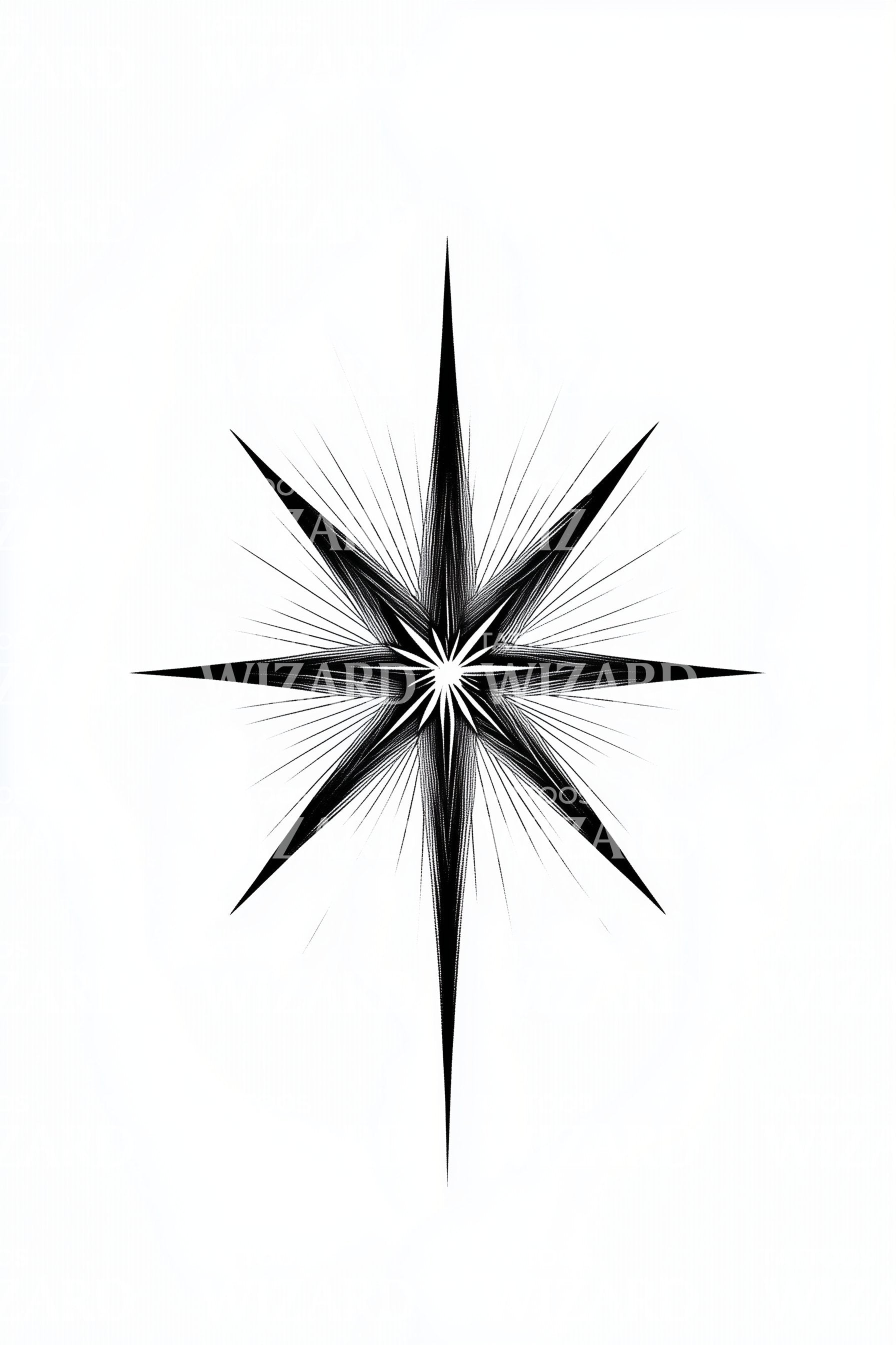 Northbound radiance in pure blackwork: an eight-point star-compass built from razor-fine rays and dense gradients, floating in white space. Symbol of true north and cosmic guidance, it honors choices, journeys, and resilience. Worn on skin, it feels calm, anchored, and celestial, a minimalist vow to navigate forward.
