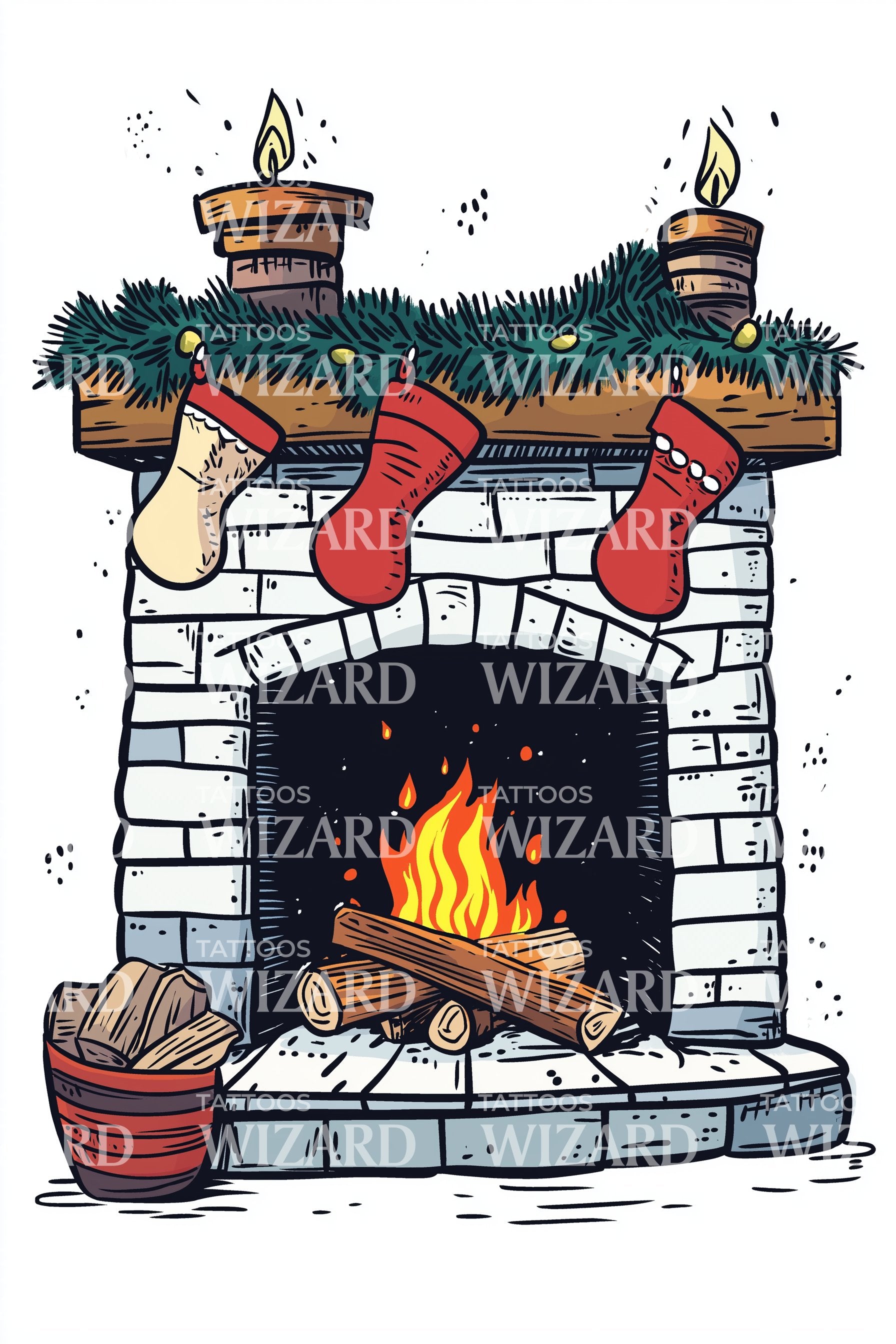 Cozy Fireplace with Stockings Tattoo Illustration