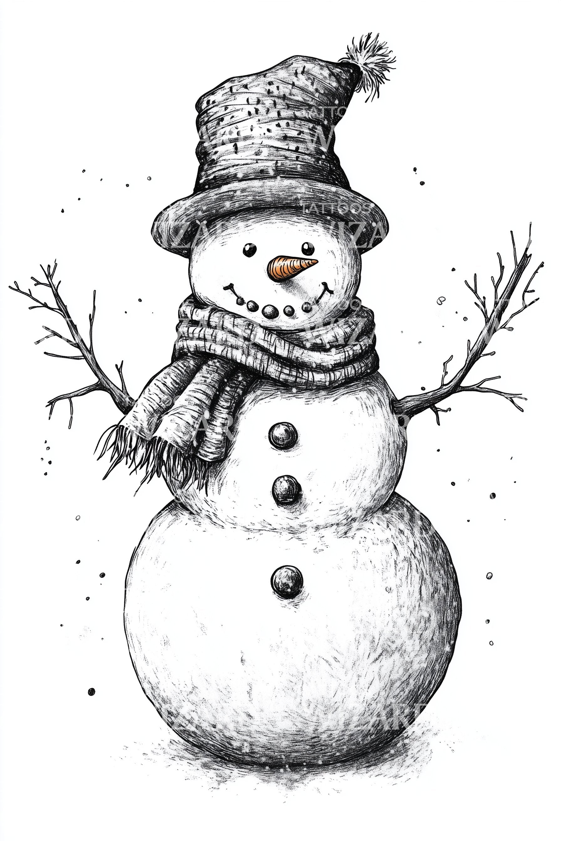 Crisp blackline illustration captures a classic snowman: carrot nose, coal-button smile, twig arms, a ribbed scarf and floppy hat dusted with flurries. Symbol of warmth in winter, resilience and childlike wonder. Wearing it feels like a cozy breath of cold air, inviting quiet joy, nostalgia, and steadfast cheer.